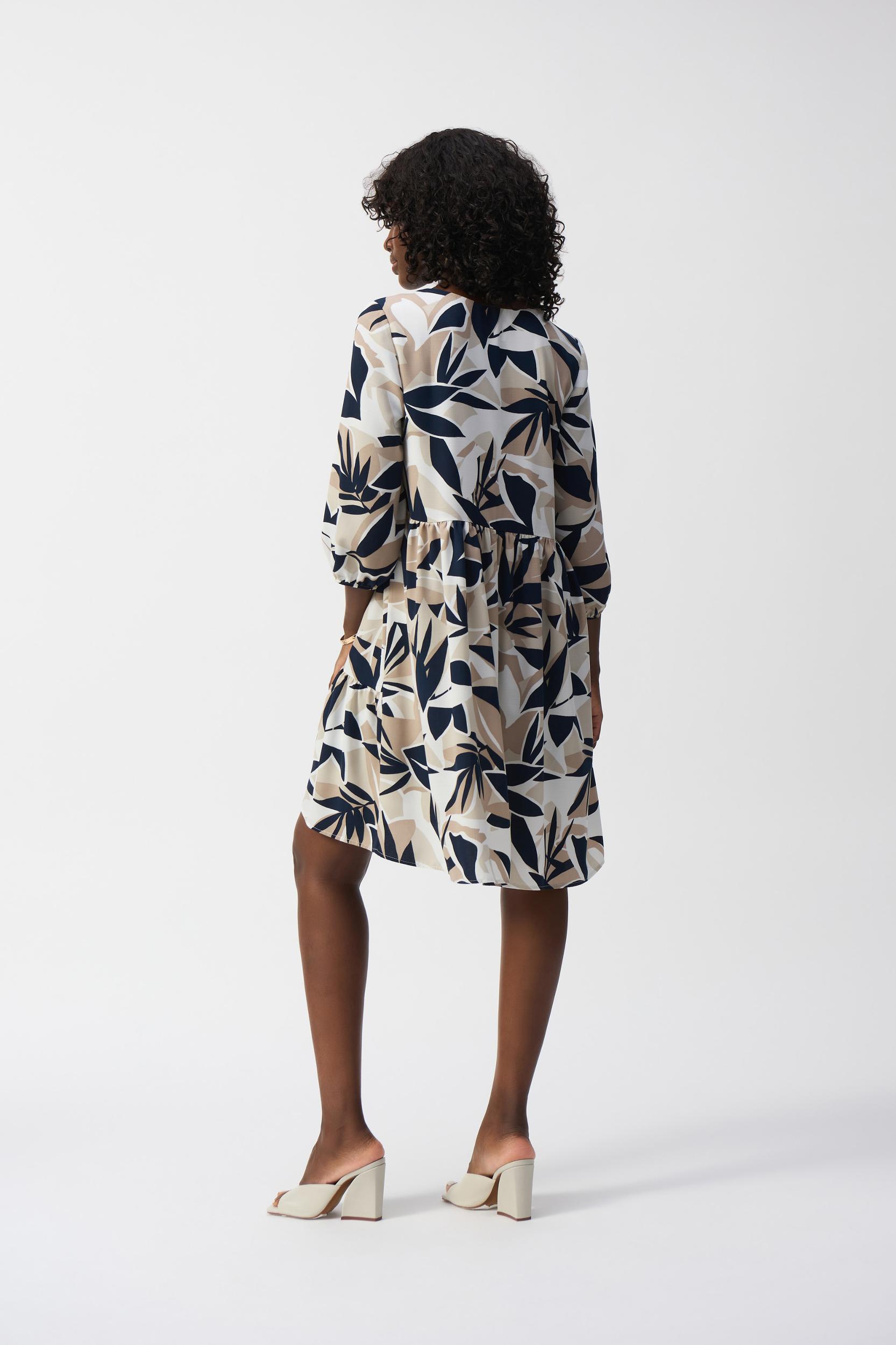 Display your flair for bold style in this lovely tiered dress. The gauze fabric pairs beautifully with the piece’s tropical print to create a charming look. The sleek V-shaped neckline and the three-quarter puff sleeves elevate the garment’s chic trapeze silhouette and accentuate its polished design.