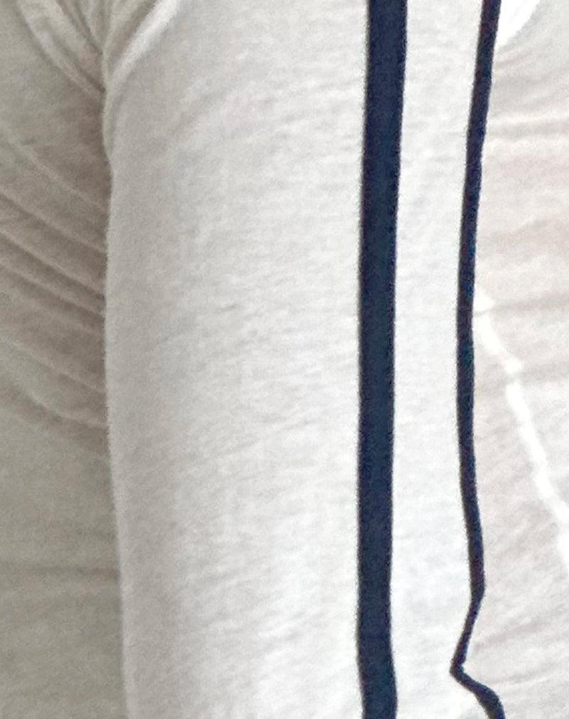 Off white long sleeve top with navy stripe detailing down the arms, a cropped fit and wide scoop neckline that hangs just below the shoulders. MODEL WEARS SIZE: SMALL - MODEL HEIGHT: 5'7