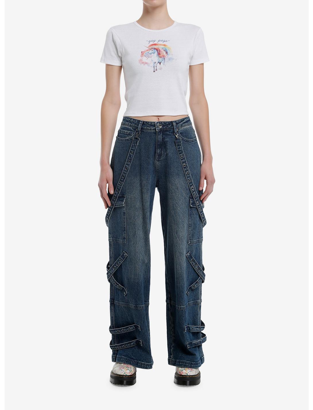 The gay gasp can be heard from miles away! Grab this cropped white tee showing a watercolor-style graphic if a unicorn and a rainbow, with *gay gasp* written above.50% cotton; 50% polyesterWash cold; dry lowLength: 17 1/2"Imported Model is 5'10"Model wears size Small