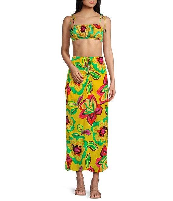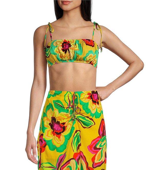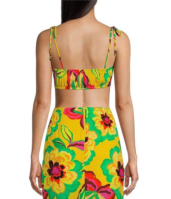 From GB, this top features:Printed crinkle Rayon fabricationSquare necklineSleevelessTie spaghetti strapsLinedApprox. 14.5" length from shoulder to hemPullover stylingBralette silhouetteRayonLining of polyesterMachine wash cold/hang to dryDo not dry cleanImported.