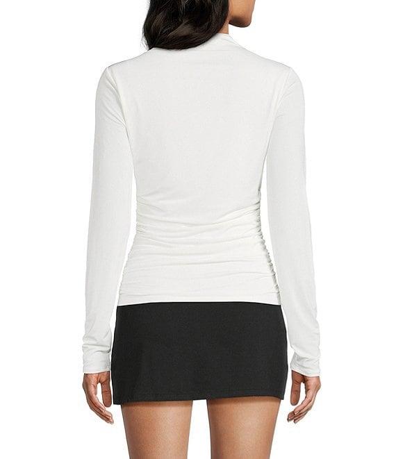 From GB, this top features: Mock neck Long sleeves Pullover styling Fitted ruched style Straight hem Polyester/spandex Machine wash/tumble dry Imported.