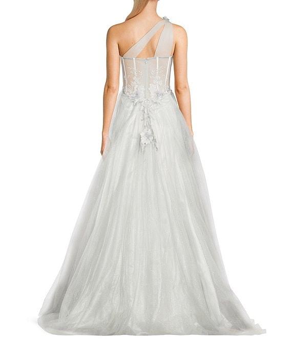 From GB Social, this dress features: Asymmetrical one-shoulder neckline Floral lace applique with sparkle detailing Sleeveless mesh layers Slit in skirt A-line silhouette Side zip closure Polyester Do not wash or dry clean/spot clean only with cold water Imported.