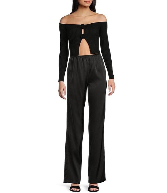 From GB, this top features: Ribbed knit fabrication Off-the-shoulder neckline Long sleeves Cutout front with rosette details Pullover styling Swing front Rayon/polyester Machine wash/dry flat Imported.