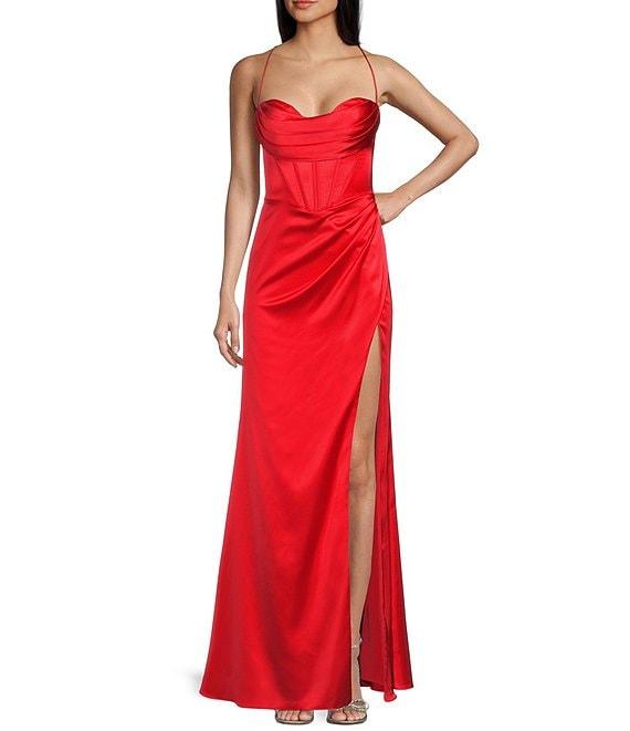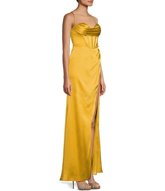 GB Social Corset Cowl Neck Lace-Up Back Slit Hem Satin Long Dress