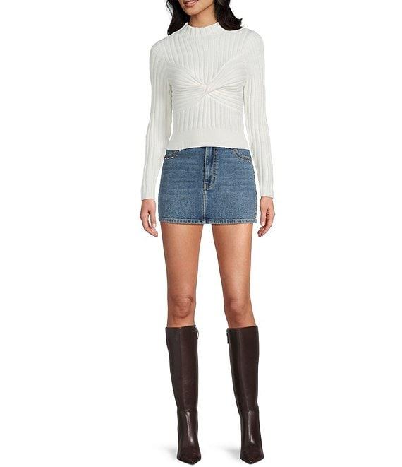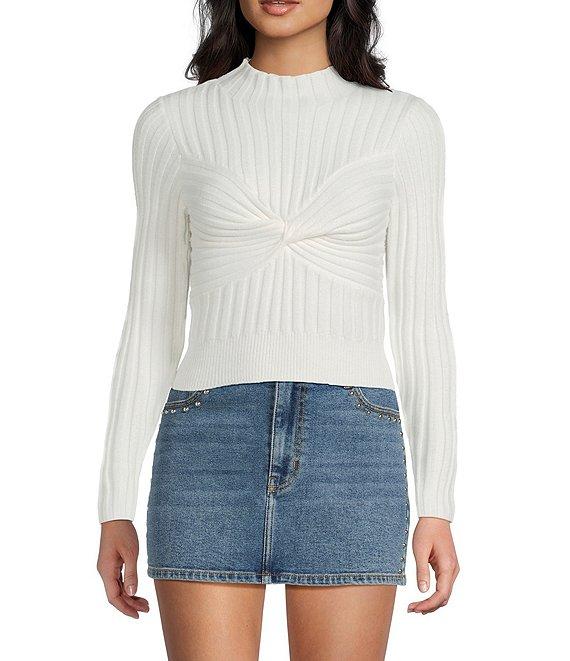 From GB, this sweater features: Ribbed sweater fabric Mock neckline Long sleeves Twist front detail Pullover styling Rayon/polyester/nylon Hand wash Imported.