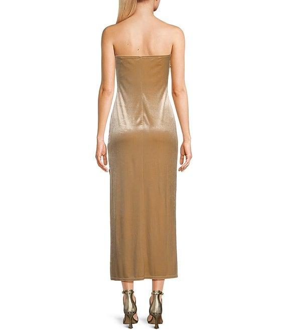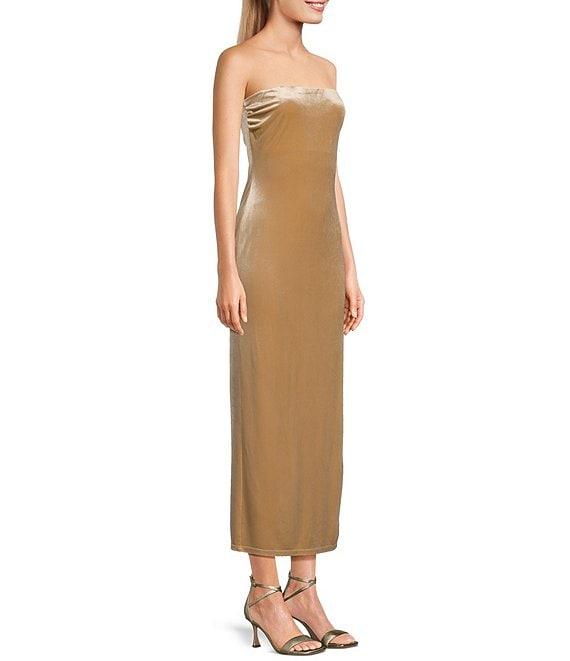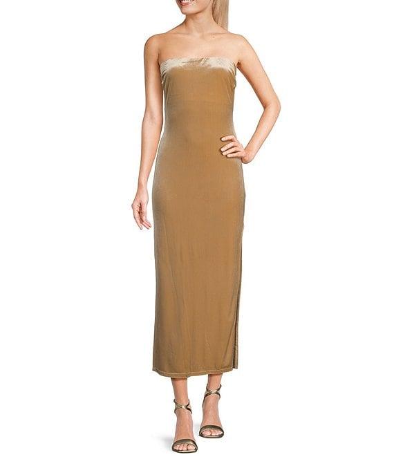 From GB, this dress features: Velvet Strapless neckline Sleeveless Side slit Sheath skirt silhouette Long HPSL 54" Polyester/spandex Machine wash/dry flat Imported.