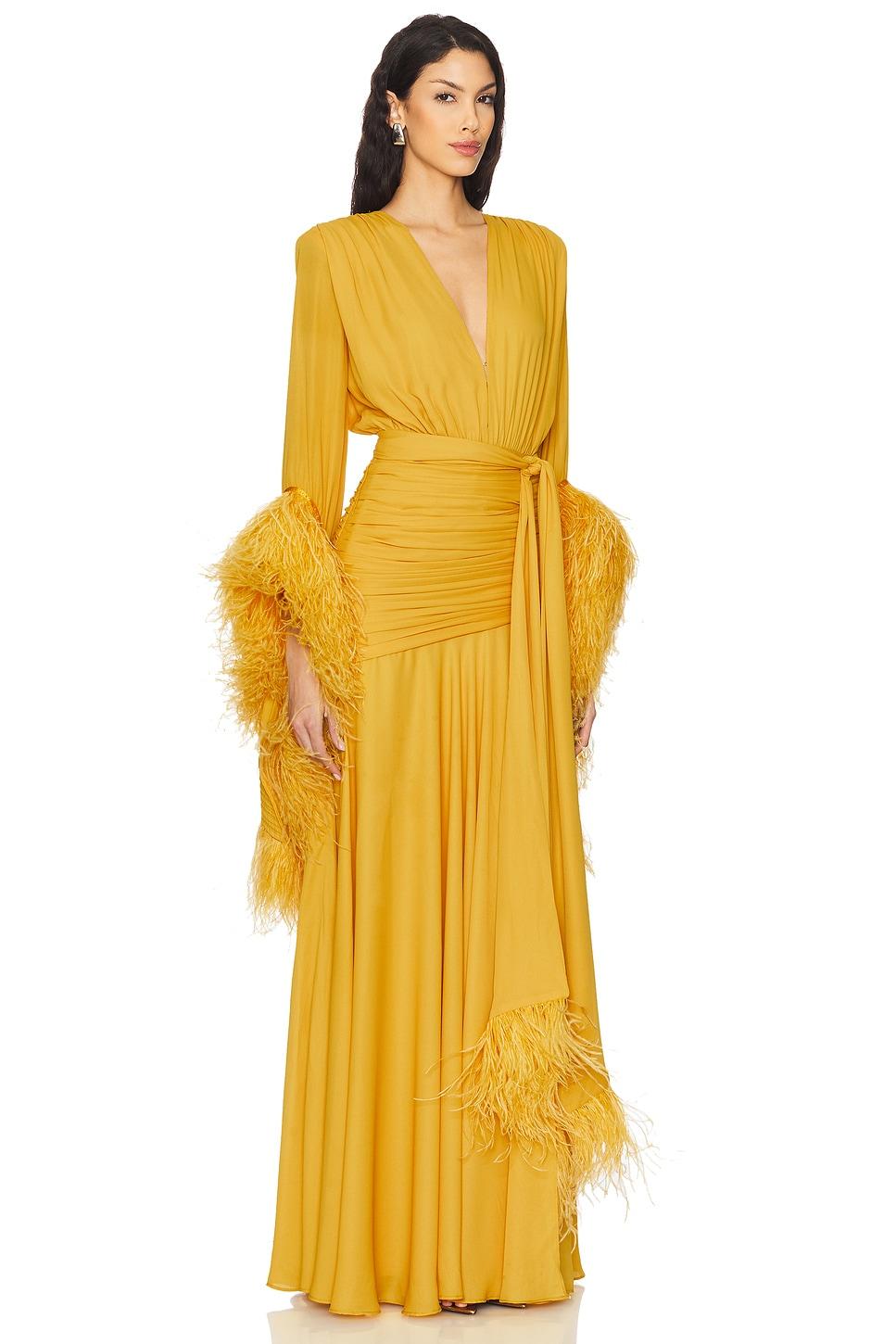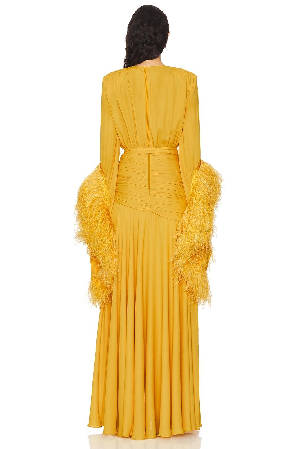 Shell 1: 60% polyester, 40% silkShell 2: 100% ostrich feather Lining: 95% polyester, 5% elastane. Made in China. Dry clean recommended. Fully lined. Back zipper closure. Padded shoulders. Hook and eye closure at frontOptional waist tie. This product contains animal fur and may be subject to shipping restrictions based on your address at checkout. Revolve Style No. BROR-WD757. Manufacturer Style No. BB-22-030MS.