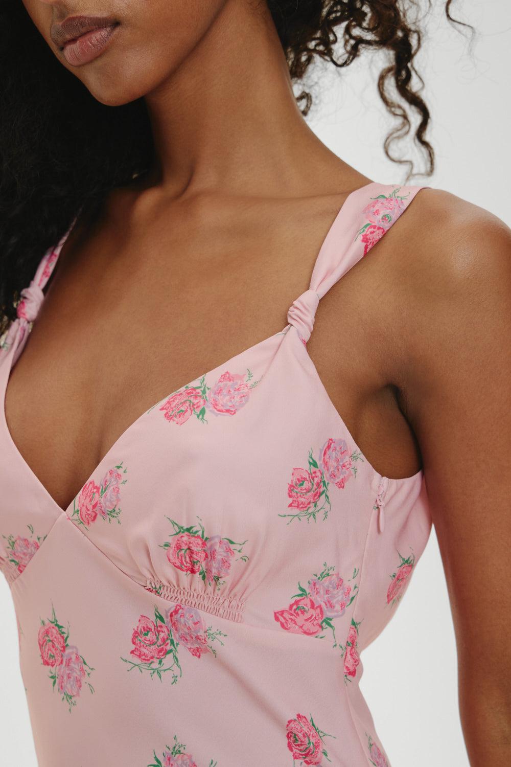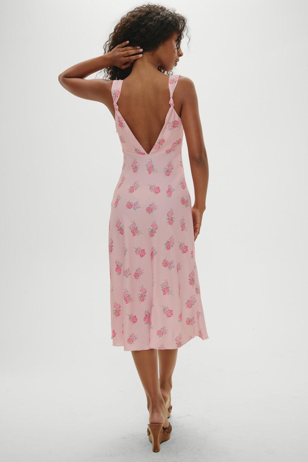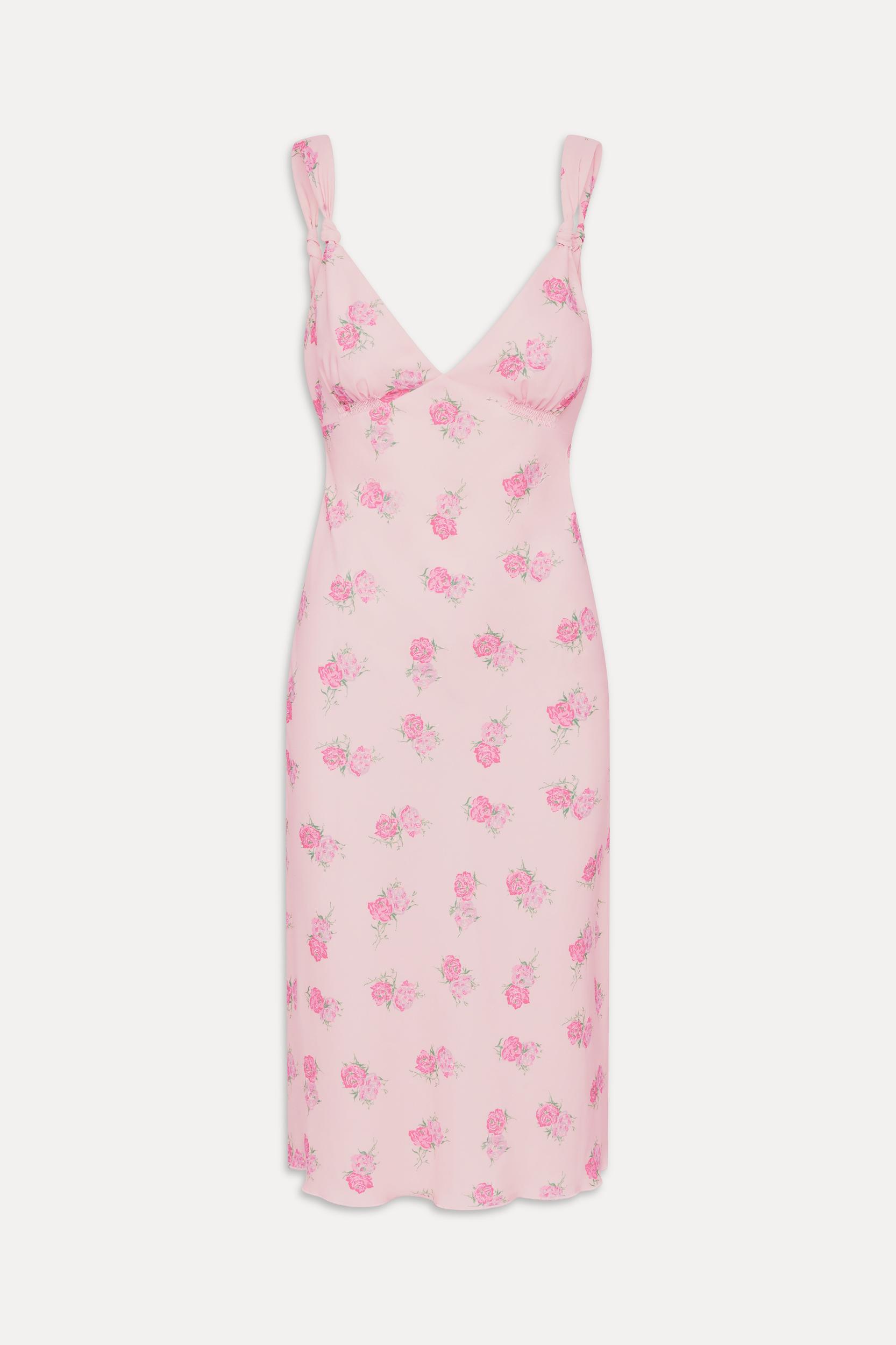 The Gem dress is your newest summer slip. This midi features knotted straps, a flattering v-neckline, and a slim silhouette through the waist that flows into a floaty skirt. Details Midi length slip dress Open back design Lightweight crepe fabric Knotted straps Slim fit through the waist Designed in a new Fresh Rose floral pattern