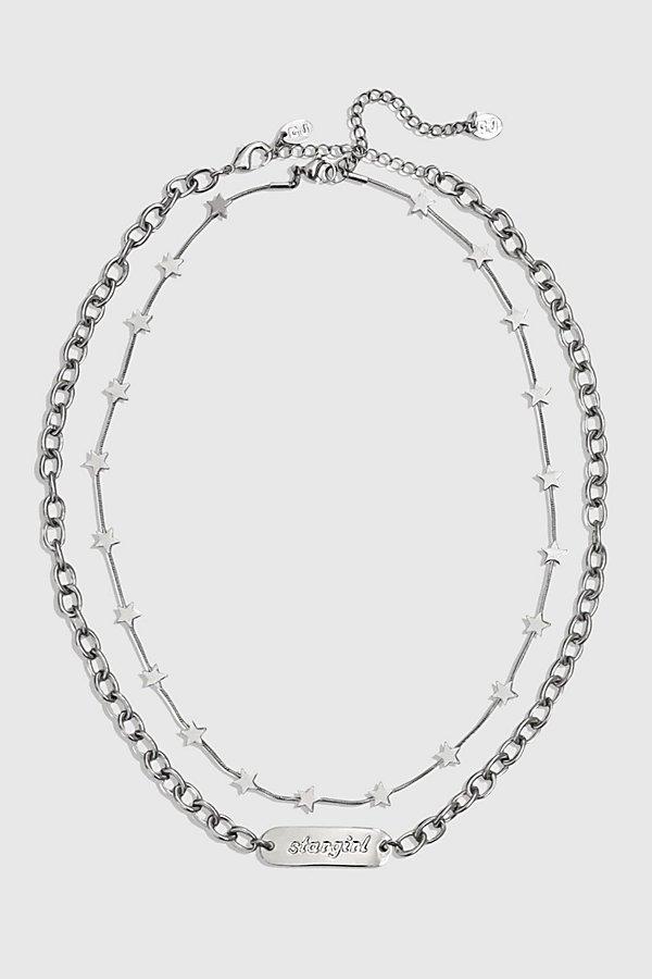 Double layered silver necklaces with an engraved Stargirl plate. Can be worn together or separately. As seen on Olivia Rodrigo for her GUTS World Tour. Content + Care -Chain material: Stainless steel, silver plated brass Keep away from liquid exposure to avoid tarnishing! Imported Size + Fit Chain length: 16 inches + 2 inch extension chain (18 inches maximum) Gemini Jewels Stargirl Layered Necklace in Silver, Womens at Urban Outfitters