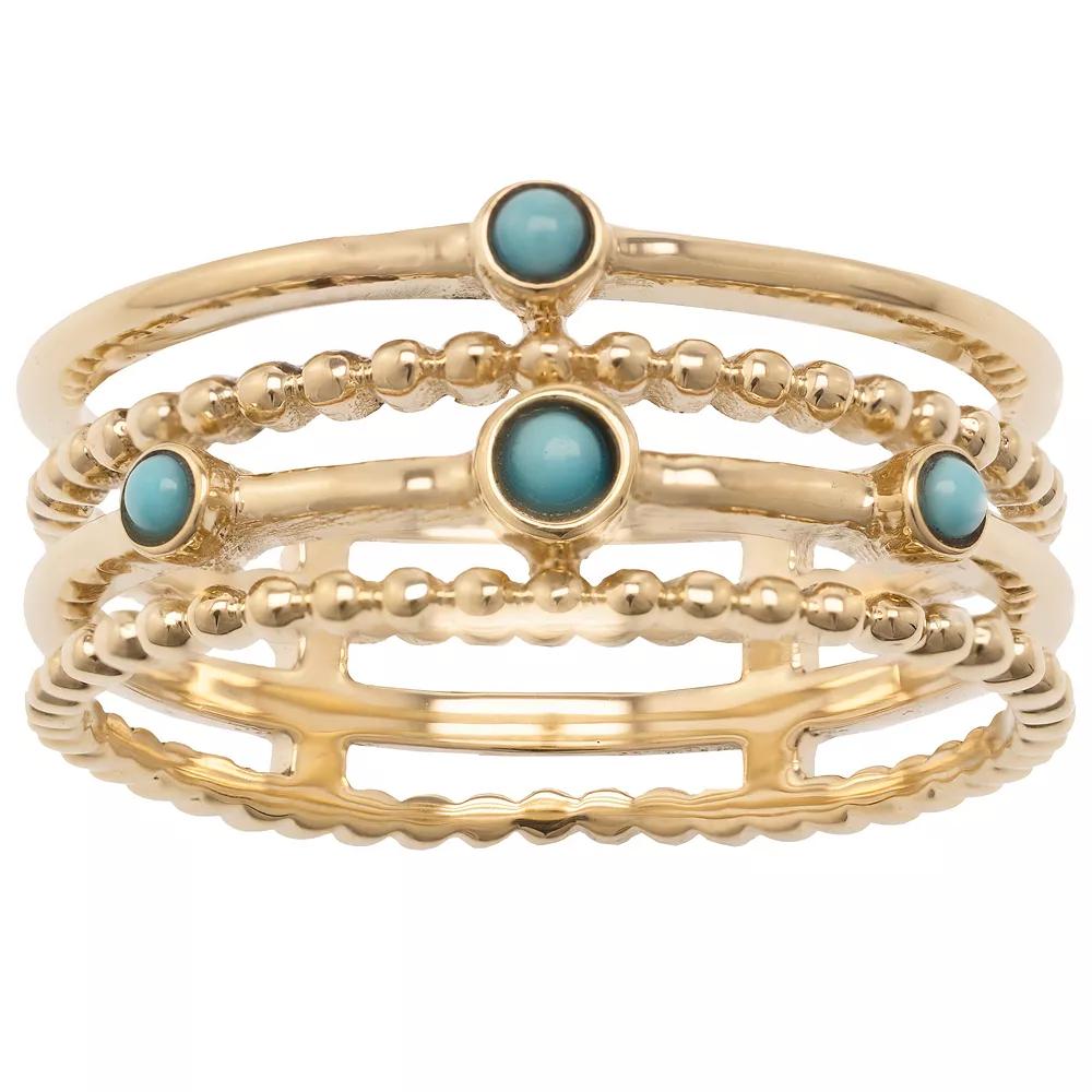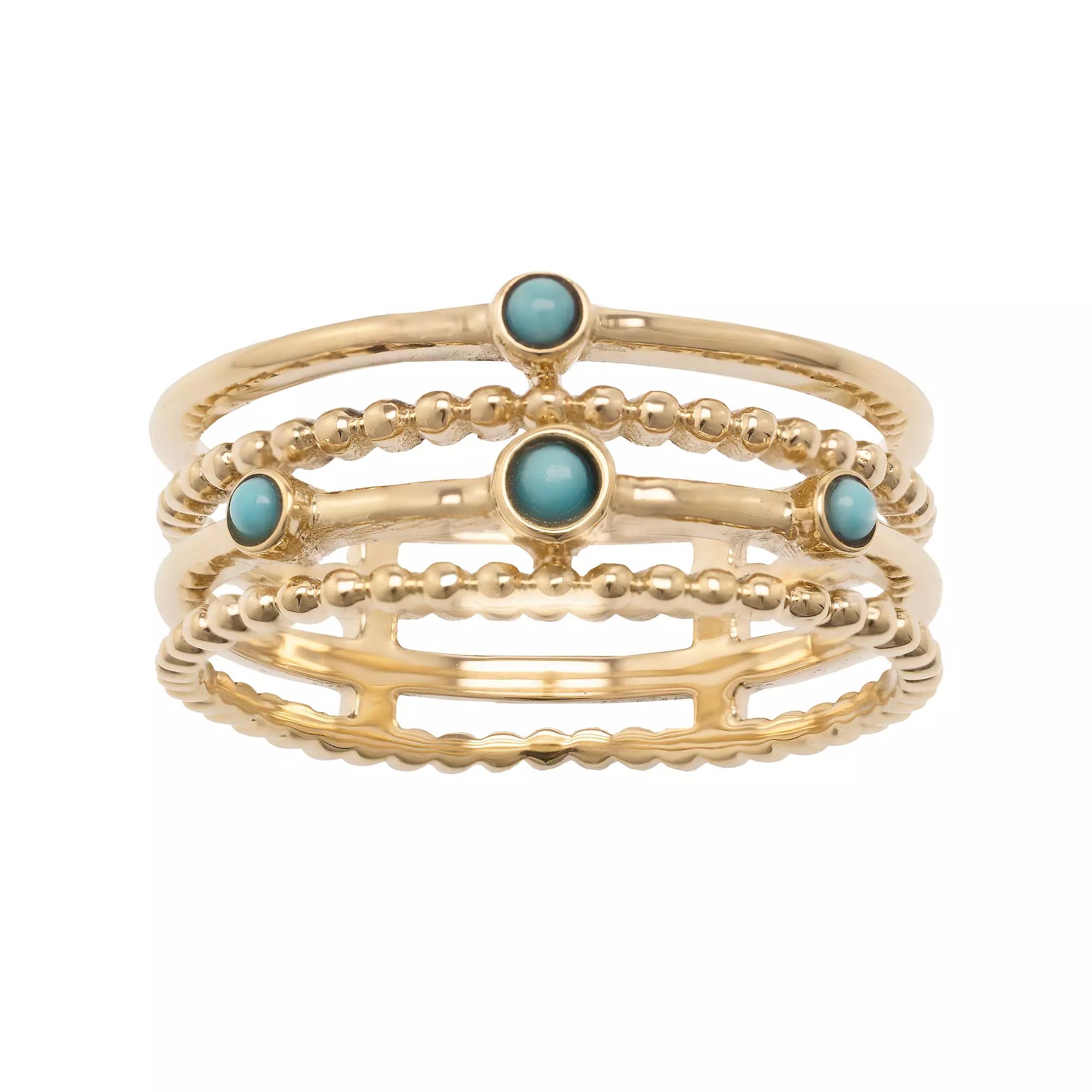 Add a touch of color to your unique style with this Gemistry turquoise stack ring. Add a touch of color to your unique style with this Gemistry turquoise stack ring. Nickel free Metal: 14k gold Packaging: velvety pouch Plating: 14k gold Width: 20 mm Finish: polishedSTONE DETAILS Stone type: turquoise Total weight: 1/6 ct. Center stone size: 2 mm x 2 mm Shape: round Setting: bezel Gemstones may have been treated to enhance their appearance. Special care may be required. Please visit our Gemstone Treatment & Special Care Guide for more information. Please note, due to the high value of this item, a signature may be required upon delivery. Size: 7. Gender: female. Age Group: adult.