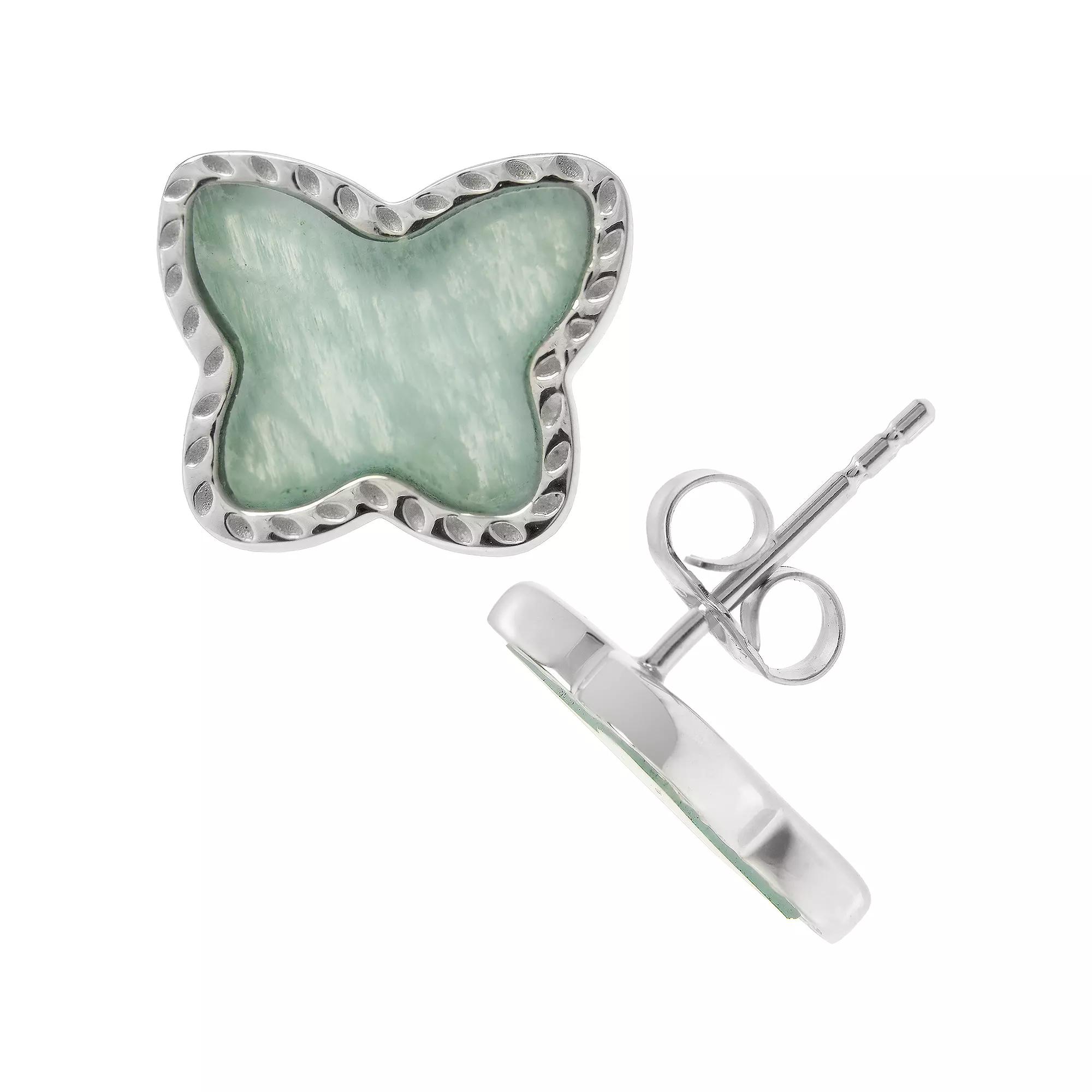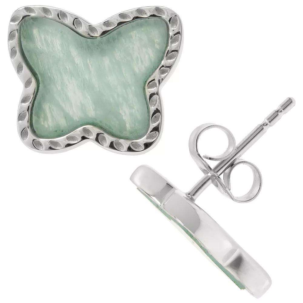 Adorned with amazonite gemstones, these stud earrings by Gemistry are an enchanting choice. Adorned with amazonite gemstones, these stud earrings by Gemistry are an enchanting choice. Nickel free Metal: sterling silver Backings: post Packaging: velvety pouch Plating: rhodium Finish: polished Diameter: 10.4 mm x 13 mmSTONE DETAILS Stone type: amazonite Total weight: 2 3/4 ct. Center stone size: 8 mm x 10 mm Shape: butterfly Setting: bezel Gemstones may have been treated to enhance their appearance. Special care may be required. Please visit our Gemstone Treatment & Special Care Guide for more information. Color: Green. Gender: female. Age Group: adult.