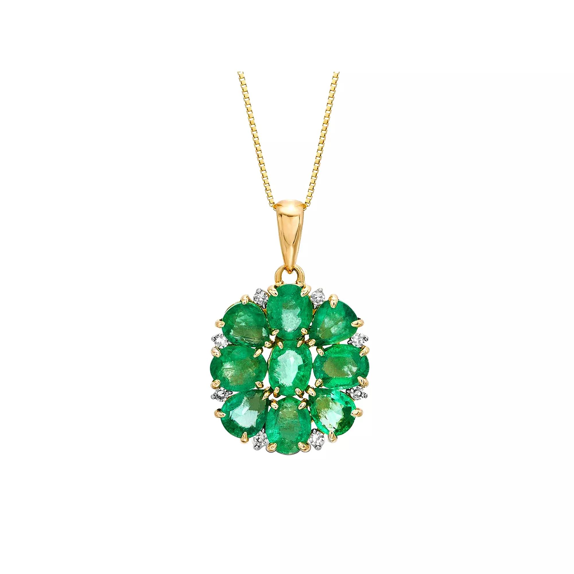 This gorgeous 10k gold diamond accent and emerald pendant necklace is the perfect way to finish any outfit. This gorgeous 10k gold diamond accent and emerald pendant necklace is the perfect way to finish any outfit. Pendant size: 0.87"L x 0.55"W Chain length: 18 in. Chain type: box Clasp: spring-ring Metal: 10k gold Finish: polished Packaging: boxedSTONE DETAILS Stone type: emerald Total weight: 2 7/8 ct. Center stone size: 5 mm x 4 mm Shape: oval Setting: prongDIAMOND DETAILS Total weight: less than 1/10 ct. Shape: round Setting: prong Diamond weights are approximate. Diamond total weights may vary between .01 and .08 ct. Some diamonds have fewer than 17 facets. Gemstones may have been treated to enhance their appearance. Special care may be required. Please visit our Gemstone Treatment & Special Care Guide for more information. Image(s) may be enlarged to show detail. Please note, due to the high value of this item, a signature may be required upon delivery. Size: 18". Color: Green. Gender: female. Age Group: adult.