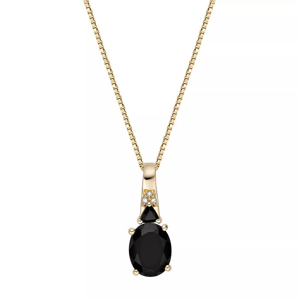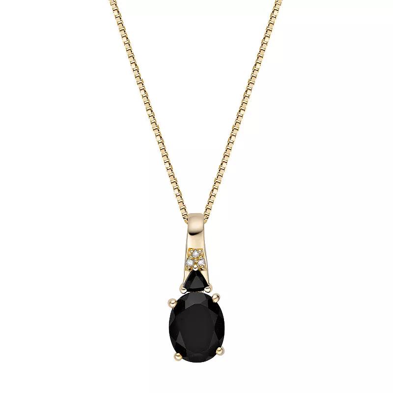 Add a touch of drama to your jewelry box with this diamond-accented 10k gold Gemminded onyx pendant necklace. Click on this JEWELRY & WATCHES GUIDE to learn about fit, styles, materials and more! Add a touch of drama to your jewelry box with this diamond-accented 10k gold Gemminded onyx pendant necklace. Click on this JEWELRY & WATCHES GUIDE to learn about fit, styles, materials and more! FEATURES Pendant necklace: 0.71 in. x 0.27 in. Chain length: 18 in. Chain type: box Clasp: spring-ring Nickel free Metal: 10k gold Finish: polished Packaging: boxed ImportedSTONE DETAILS Stone type: onyx Total weight: 1 3/4 ct. Center stone weight: 1 5/8 ct. Center stone size: 9 mm x 7 mm Shape: oval, trillion Setting: prongDIAMOND DETAILS Total weight: less than 1/10 ct. Color grade: H-I Clarity: I2-I3 Shape: round Setting: prong Diamond weights are approximate. Diamond Total Weights may vary between .01 and .13 ct. Some diamonds consist of fewer than 17 facets. Gemstones may have been treated to enhance their appearance. Special care may be required. Please visit our Gemstone Treatment & Special Care Guide for more information. Image(s) may be enlarged to show detail. Size: 18. Gender: female. Age Group: adult.