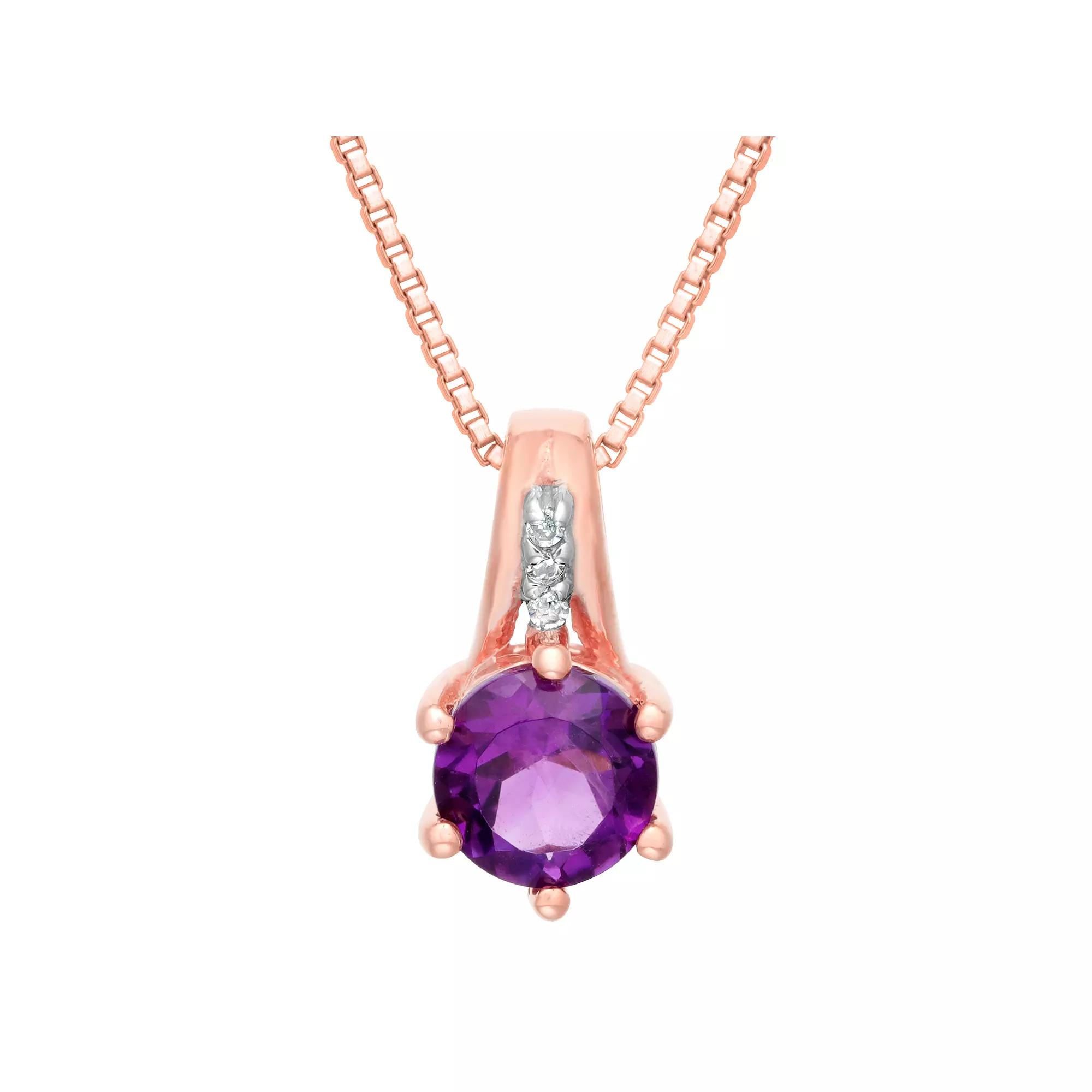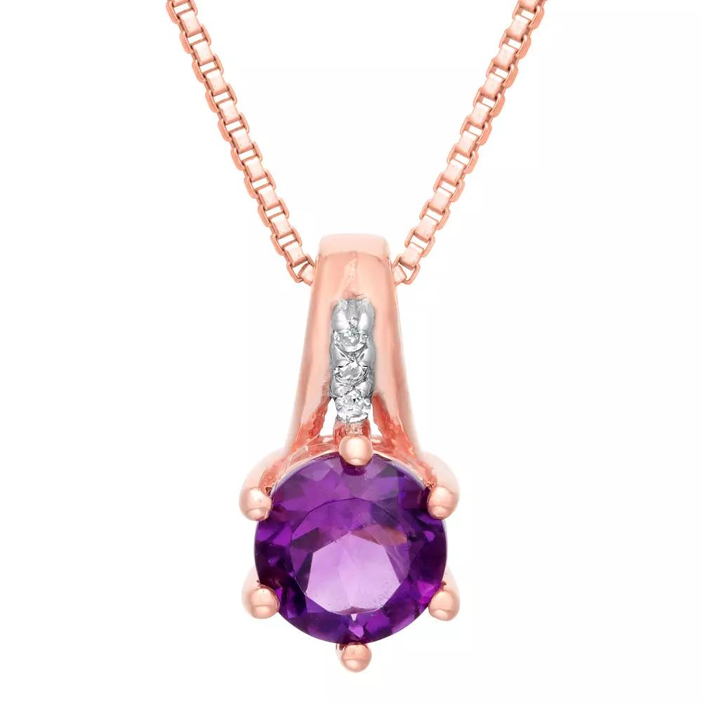 This gorgeous 10k rose gold pendant necklace showcases a dazzling amethyst and diamond accents for an accessory you will love to show off. This gorgeous 10k rose gold pendant necklace showcases a dazzling amethyst and diamond accents for an accessory you will love to show off. Pendant size: 0.39 in. x 0.2 in. Chain length: 18 in. Chain type: box Clasp: lobster-claw Metal: 10k rose gold Plating: rhodium Finish: polished Packaging: boxedSTONE DETAILS Stone type: amethyst Total weight: 3/8 ct. Center stone weight: 3/8 ct. Center stone size: 5 mm x 5 mm Shape: round Setting: prongDIAMOND DETAILS Diamond total carat weight is 0.01 ct. TDW Shape: round Setting: prong Diamond weights are approximate. Diamond total weights may vary between .01 and .08 ct. Some diamonds have fewer than 17 facets. Gemstones may have been treated to enhance their appearance. Special care may be required. Please visit our Gemstone Treatment & Special Care Guide for more information. Image(s) may be enlarged to show detail. Please note, due to the high value of this item, a signature may be required upon delivery. Size: 18". Color: Purple. Gender: female. Age Group: adult.
