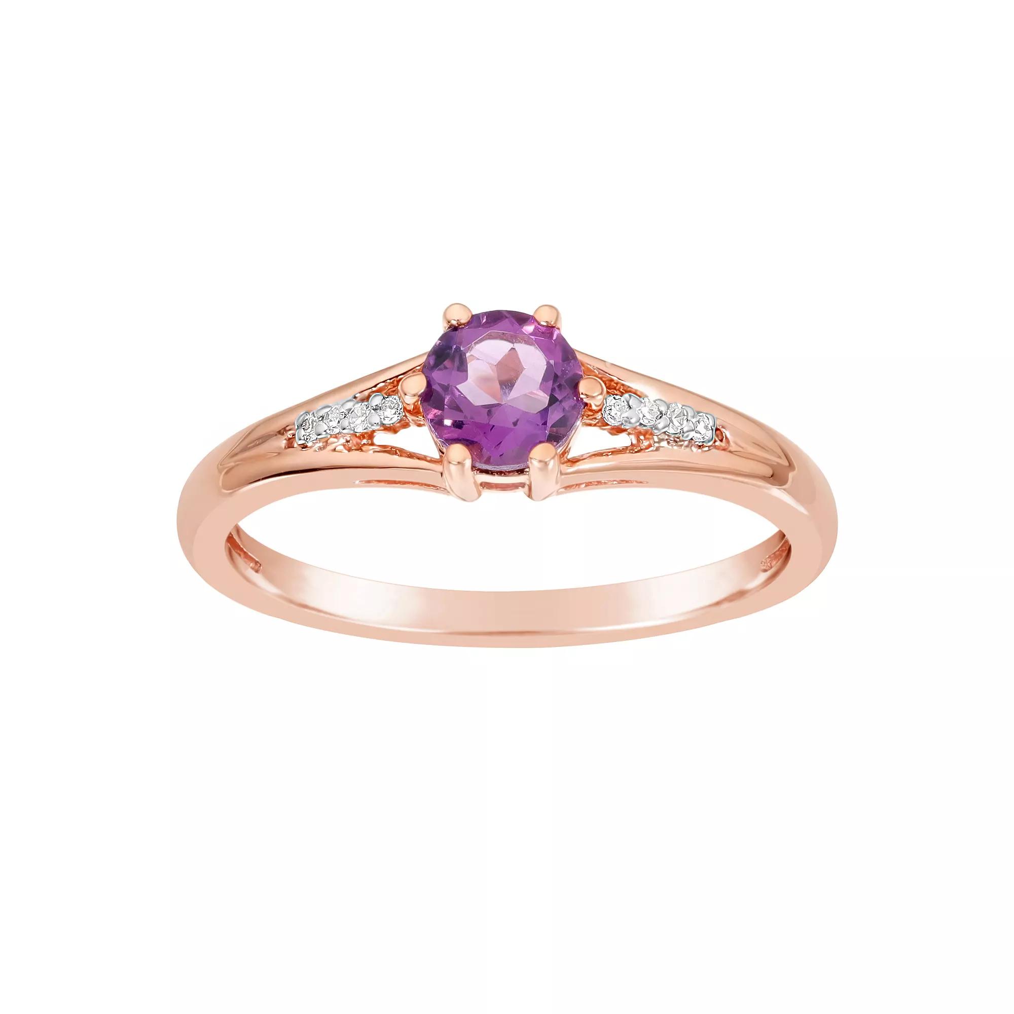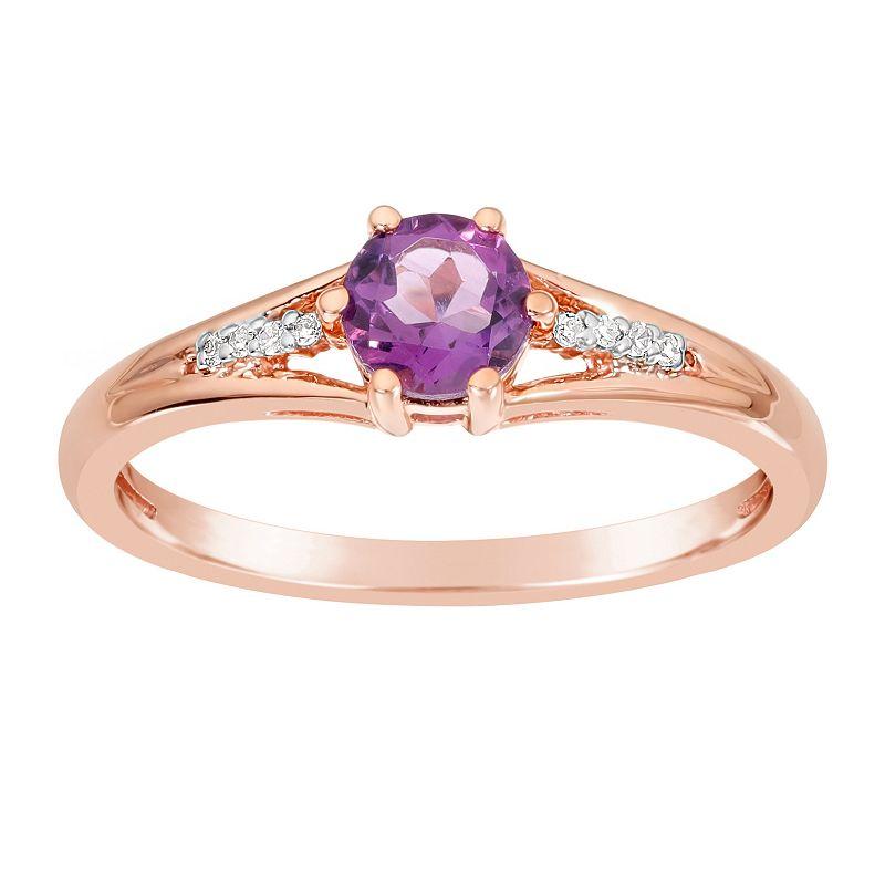 This gorgeous 10k rose gold ring showcases a dazzling amethyst and diamond accents for an accessory you will love to show off. This gorgeous 10k rose gold ring showcases a dazzling amethyst and diamond accents for an accessory you will love to show off. Width: 5 mm Metal: 10k rose gold Plating: rhodium Finish: polished Packaging: boxedSTONE DETAILS Stone type: amethyst Total weight: 3/8 ct. Center stone weight: 3/8 ct. Center stone size: 5 mm x 5 mm Shape: round Setting: prongDIAMOND DETAILS Diamond total carat weight is 0.024 ct. TDW Shape: round Setting: prong Diamond weights are approximate. Diamond total weights may vary between .01 and .08 ct. Some diamonds have fewer than 17 facets. Gemstones may have been treated to enhance their appearance. Special care may be required. Please visit our Gemstone Treatment & Special Care Guide for more information. Image(s) may be enlarged to show detail. Please note, due to the high value of this item, a signature may be required upon delivery. Size: 6. Color: Purple. Gender: female. Age Group: adult.
