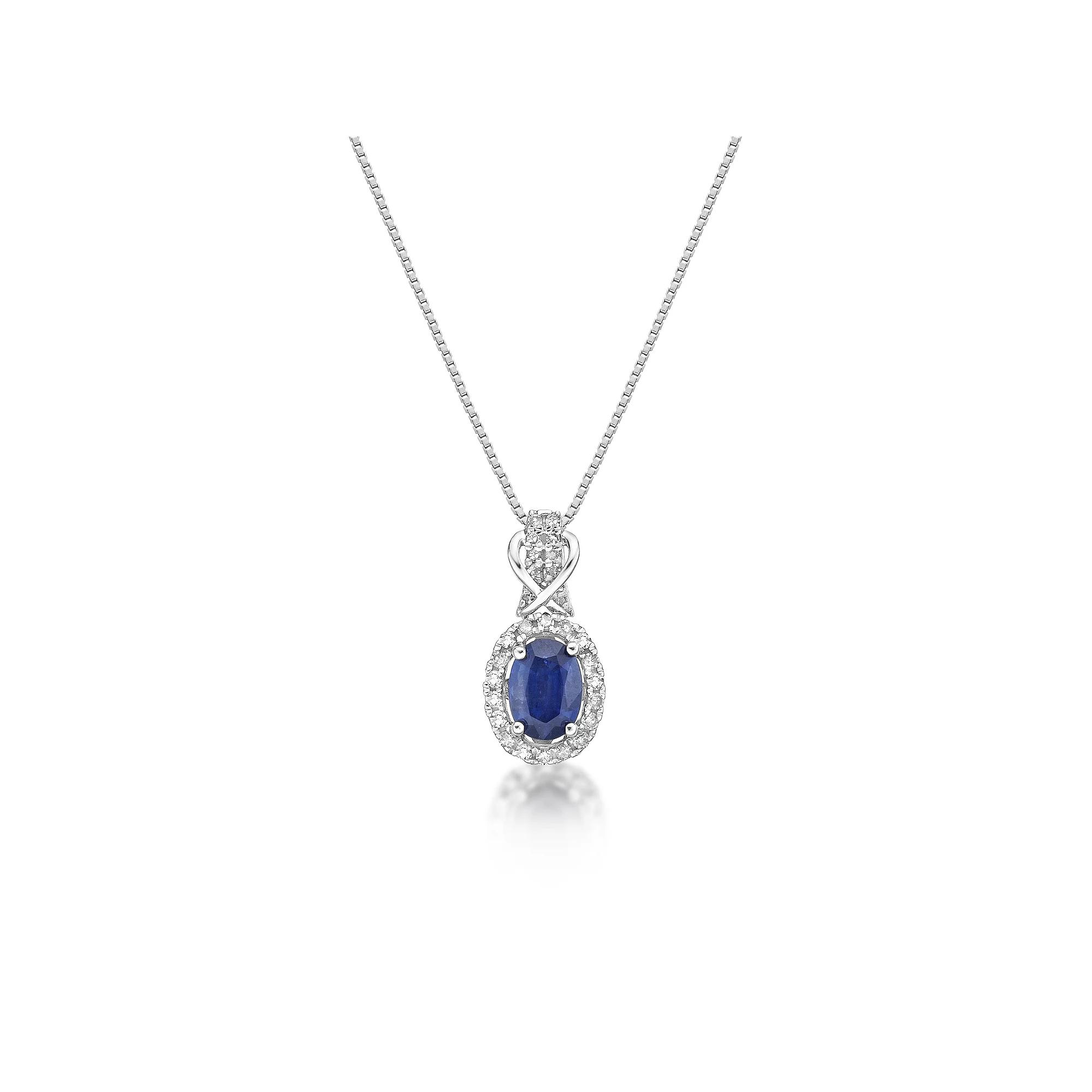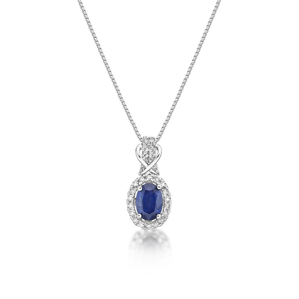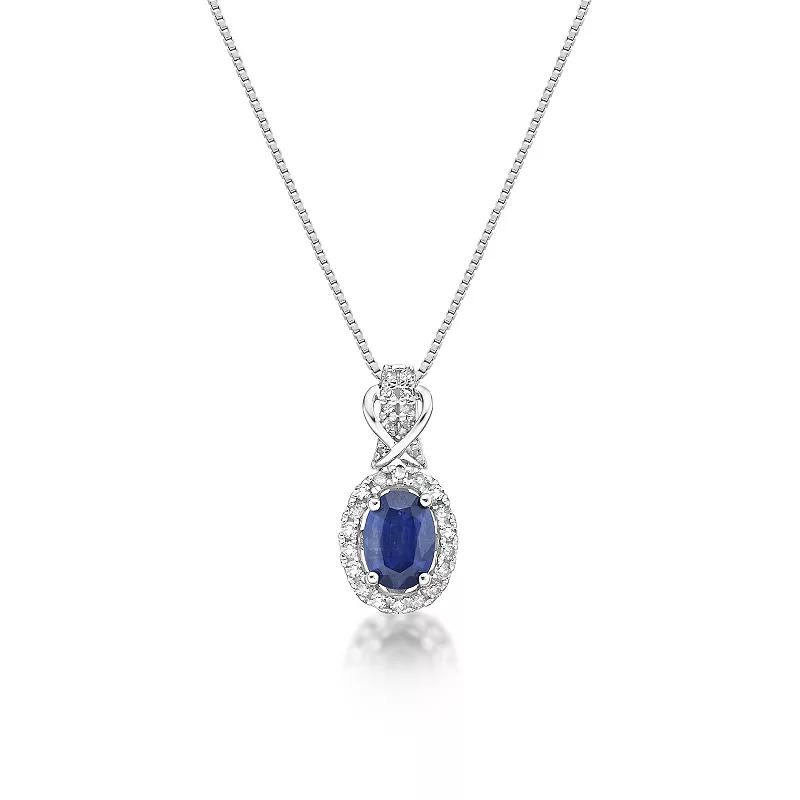 Featuring an oval-cut, genuine sapphire center stone framed with shimmering diamonds, this 10k white gold necklace is a beautiful complement to your attire. Featuring an oval-cut, genuine sapphire center stone framed with shimmering diamonds, this 10k white gold necklace is a beautiful complement to your attire. NECKLACE DETAILS Pendant size: 0.63" x 0.31" Chain length: 18 inch Chain type: box Clasp: spring-ring Metal: 10k White Gold Plating: rhodium Finish: polished Packaging: boxedSTONE DETAILS Stone type: sapphire Center stone size: 7 mm x 5 mm Shape: oval Setting: prongDIAMOND DETAILS Total weight: 1/7 ct. Shape: round Setting: prong Diamond weights are approximate. Diamond total weights may vary between .01 and .08 ct. Some diamonds have fewer than 17 facets. Gemstones may have been treated to enhance their appearance. Special care may be required. Please visit our Gemstone Treatment & Special Care Guide for more information. Image(s) may be enlarged to show detail. Please note, due to the high value of this item, a signature may be required upon delivery. Size: 18". Color: Blue. Gender: female. Age Group: adult.
