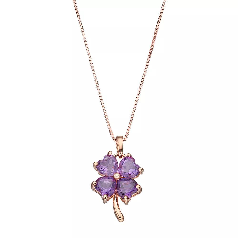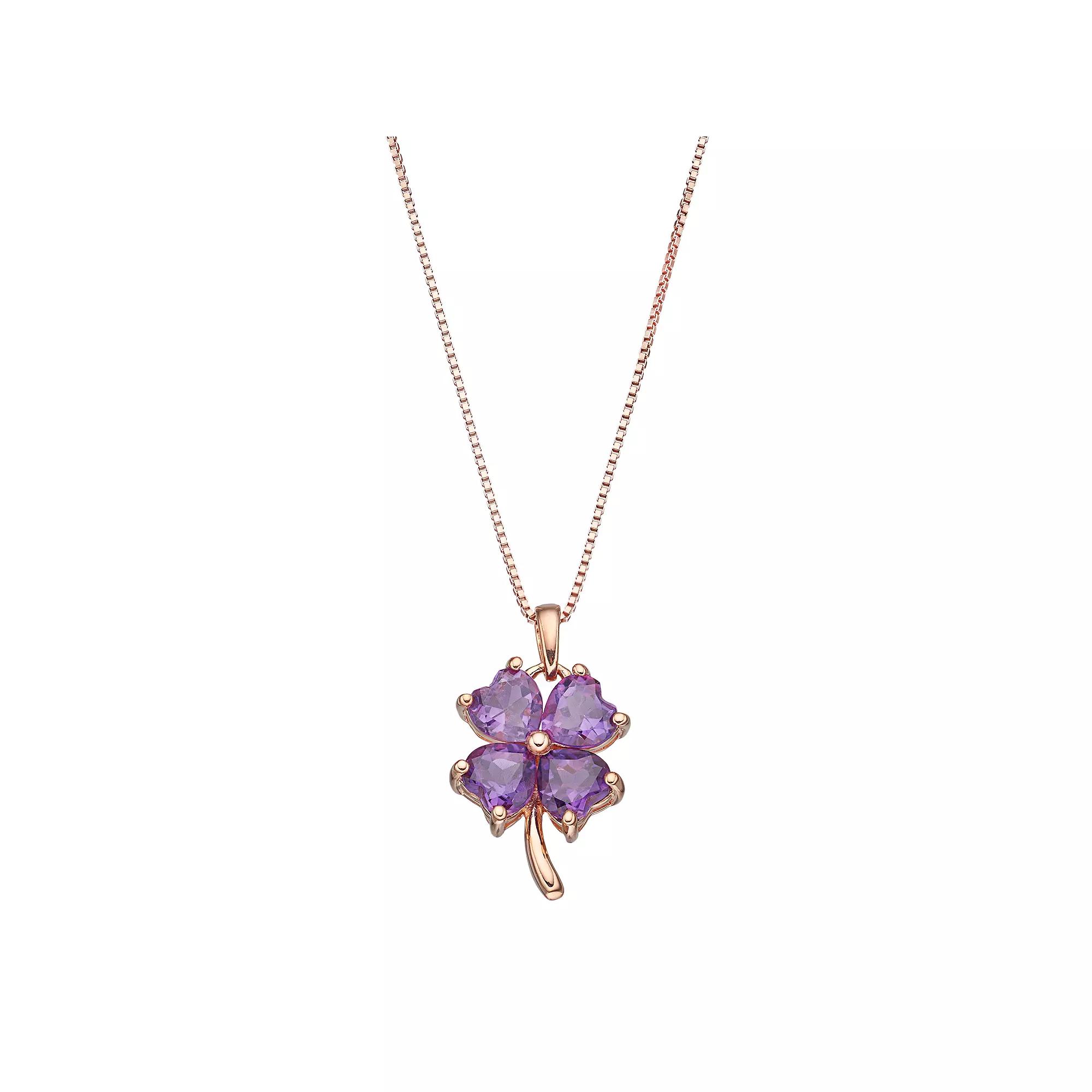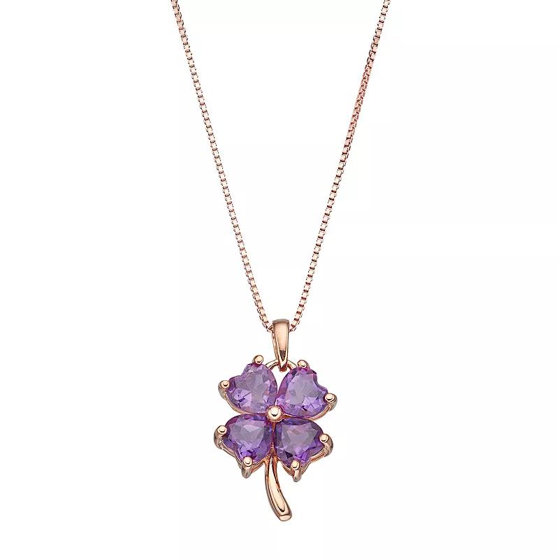 Featuring a four-leaf clover design adorned with heart-cut amethyst stones, this 14k rose gold over silver pendant necklace is perfectly chic.PENDANT DETAILS Pendant length: .8 in. Chain length: 18 in. Chain type: box Clasp: spring-ring Metal: sterling silver Plating: 14k rose gold Finish: polished Packaging: boxed STONE DETAILS Stone type: amethyst Total weight: 3/8 ct. Shape: heart-cut Setting: prong Gemstones may have been treated to enhance their appearance. Special care may be required. Please visit our Gemstone Treatment & Special Care Guide for more information. Size: 18". Color: Purple. Gender: female. Age Group: adult. Material: Gold Over Sterling.