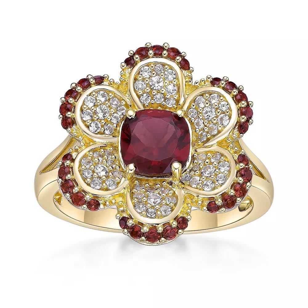 Enhance your look with this Gemminded 2 Micron Gold Over Silver Garnet & Lab-Created White Sapphire Flower Ring. Click on this JEWELRY & WATCHES GUIDE to learn about fit, styles, materials and more! Enhance your look with this Gemminded 2 Micron Gold Over Silver Garnet & Lab-Created White Sapphire Flower Ring. Click on this JEWELRY & WATCHES GUIDE to learn about fit, styles, materials and more! FEATURES Width: 16 mm Shank style: split Band fit: flat Nickel safe Metal: sterling silver Plating: 18k gold Finish: polished Packaging: boxed ImportedSTONE DETAILS Stone type: garnet, lab-created white sapphire Total weight: 1 7/8 ct. Center stone weight: 1 1/5 ct. Center stone size: 6 mm x 6 mm Shape: cushion cut, round Setting: prong Gemstones may have been treated to enhance their appearance. Special care may be required. Please visit our Gemstone Treatment & Special Care Guide for more information. Color: Gold Tone. Gender: female. Age Group: adult.