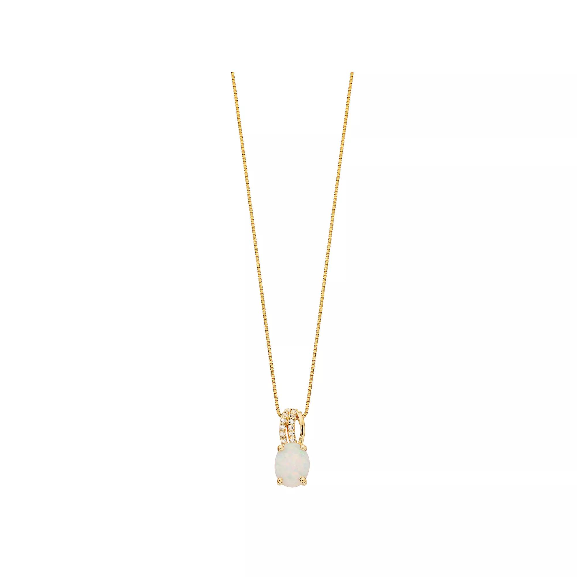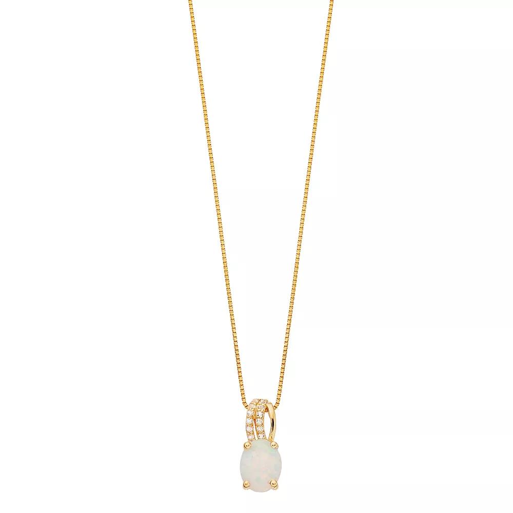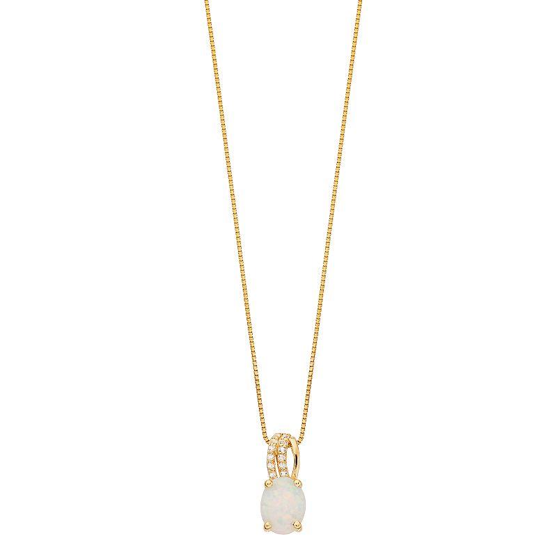 2 Micron Gold Plated Silver Pendant Necklace with 9X7 Oval Created Opal and White Topaz on 18" Box Chain | Belk & Co Lab Created 1 Ct. T.w. Lab-Created Opal And 1/8 Ct. T.w. White Topaz Pendant Necklace In Gold Plated Sterling Silver