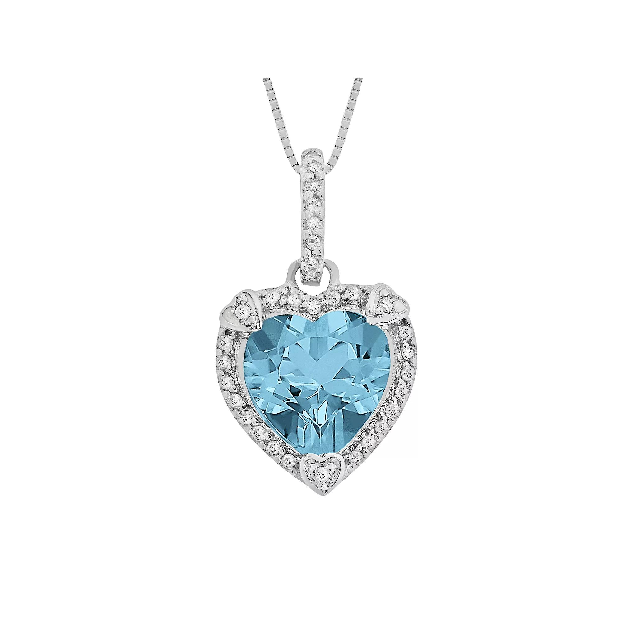 A heart-cut blue topaz stone gives this pendant a breathtaking glow. You'll radiate romance every time you wear this sterling silver necklace. Pendant Details: Pendant length: .67 in. Necklace length: 18 in. Clasp: spring-ring Metal: rhodium-plated sterling silver Features: beaded detailsStone Details: Stone type: genuine blue topaz Cut: heart Setting: prongDiamond Details: Total weight: less than 1/10 ct. Cut: round Setting: prongImage(s) may be enlarged to show detail.Diamond weights are approximate. Diamond total weights may vary between .01 and .08 ct. Some diamonds have fewer than 17 facets.Gemstones may have been treated to enhance their appearance. Special care may be required. Please visit our Gemstone Treatment & Special Care Guide for more information. Size: 18". Gender: female. Age Group: adult.