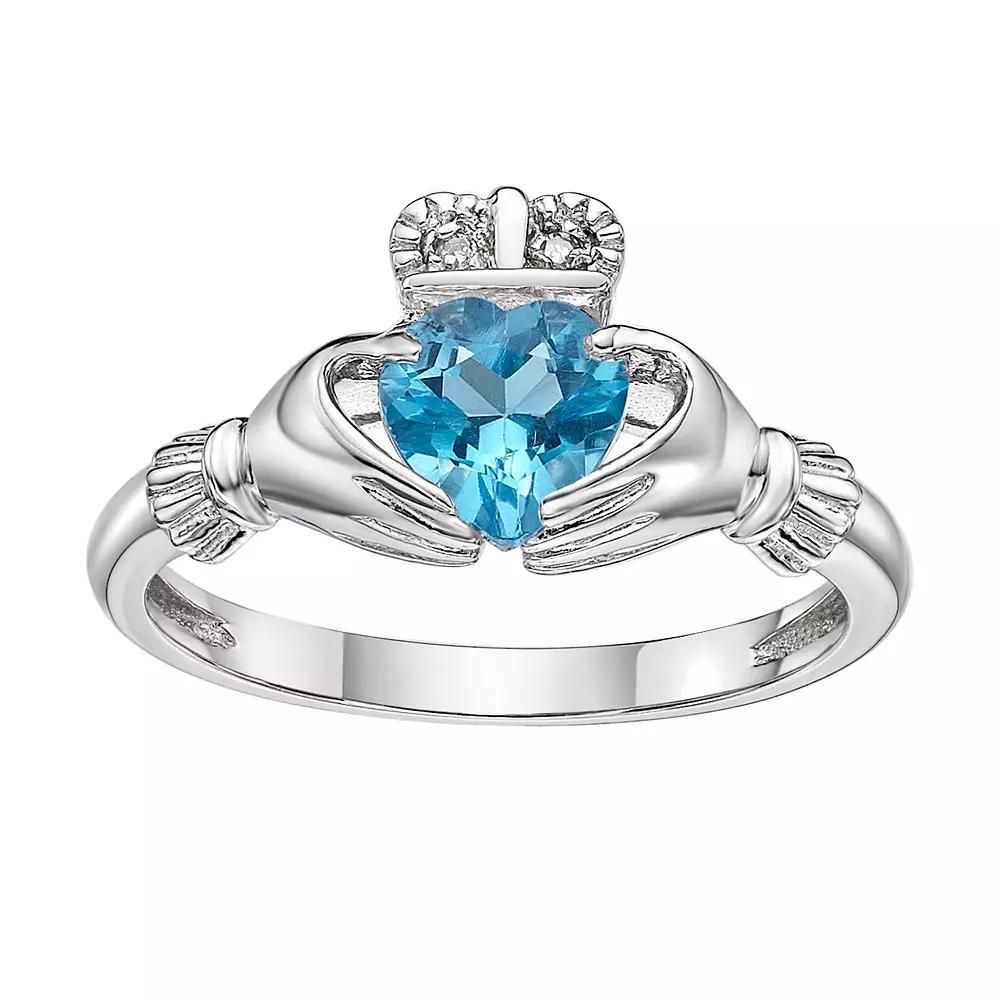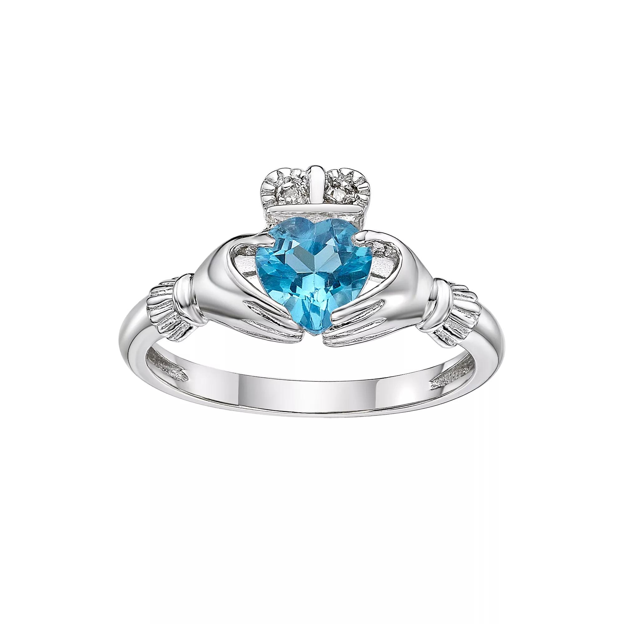 This gorgeous sterling silver diamond accent blue topaz claddagh ring is the perfect way to finish any outfit. This gorgeous sterling silver diamond accent blue topaz claddagh ring is the perfect way to finish any outfit. Width: 9 mm Metal: sterling silver Plating: rhodium Finish: polished Packaging: boxedSTONE DETAILS Stone type: blue topaz Total weight: 1 ct. Center stone size: 6 mm x 6 mm Shape: heart Setting: prongDIAMOND DETAILS Total weight: less than 1/10 ct. Shape: round Setting: prong Diamond weights are approximate. Diamond total weights may vary between .01 and .08 ct. Some diamonds have fewer than 17 facets. Gemstones may have been treated to enhance their appearance. Special care may be required. Please visit our Gemstone Treatment & Special Care Guide for more information. Image(s) may be enlarged to show detail. Please note, due to the high value of this item, a signature may be required upon delivery. Gender: female. Age Group: adult.