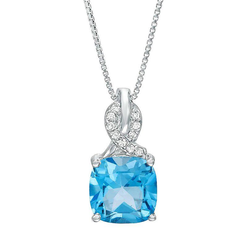 This gorgeous sterling silver blue topaz and diamond accent pendant necklace is the perfect way to finish any outfit. This gorgeous sterling silver blue topaz and diamond accent pendant necklace is the perfect way to finish any outfit. Pendant size: 0.59"L x 0.31"W Chain length: 18 in. Chain type: box Clasp: spring-ring Metal: sterling silver Plating: rhodium Finish: polished Packaging: boxedSTONE DETAILS Stone type: blue topaz Total weight: 2 3/4 ct. Center stone size: 8 mm x 8 mm Shape: cushion cut Setting: prongDIAMOND DETAILS Total weight: less than 1/10 ct. Shape: round Setting: prong Diamond weights are approximate. Diamond total weights may vary between .01 and .08 ct. Some diamonds have fewer than 17 facets. Gemstones may have been treated to enhance their appearance. Special care may be required. Please visit our Gemstone Treatment & Special Care Guide for more information. Image(s) may be enlarged to show detail. Please note, due to the high value of this item, a signature may be required upon delivery. Size: 18". Gender: female. Age Group: adult.