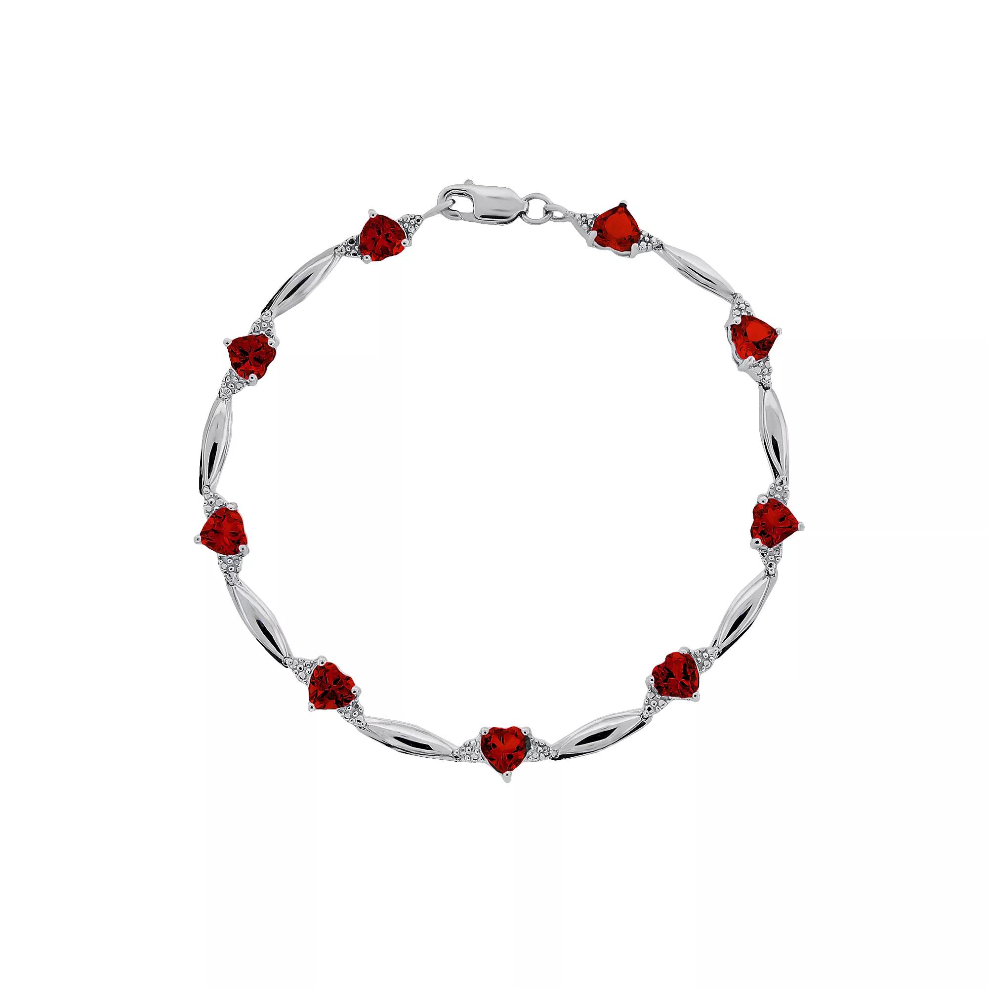 Wrapped in romance. Heart-cut genuine garnet stones and diamond accents give this sterling silver bracelet a lovely glow.Bracelet Details: Length: 7.5 in. Clasp: lobster Metal: rhodium-plated sterling silverStone Details: Stone type: genuine garnet Cut: heart Setting: prongDiamond Details: Total weight: less than 1/10 ct. Cut: round Setting: prongImage(s) may be enlarged to show detail.Diamond weights are approximate. Diamond total weights may vary between .01 and .08 ct. Some diamonds have fewer than 17 facets.Gemstones may have been treated to enhance their appearance. Special care may be required. Please visit our Gemstone Treatment & Special Care Guide for more information. Size: 7.5. Gender: female. Age Group: adult.