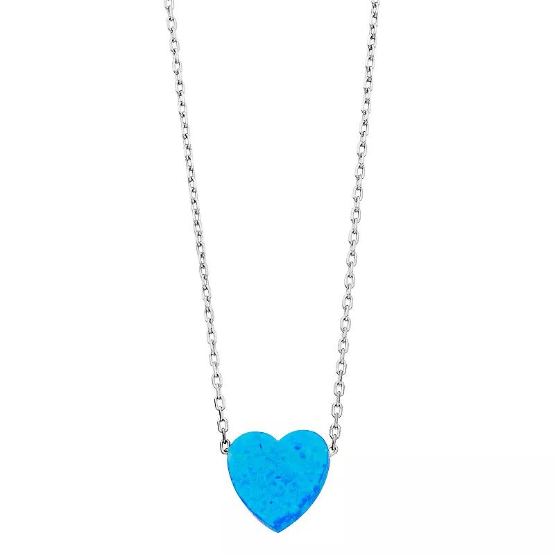 Add a fun accessory to any outfit with this lab-created blue opal pendant necklace. Add a fun accessory to any outfit with this lab-created blue opal pendant necklace. NECKLACE DETAILS Pendant size: 0.39" x 0.39" Chain length: 18 in. Chain type: cable Clasp: spring-ring Plating: rhodium Nickel free Packaging: boxed Metal: sterling silverSTONE DETAILS Stone type: lab-created blue opal Shape: heart Stone size: 10 mm x 10 mmGift Givers: This item ships in its original packaging. If intended as a gift, the packaging may reveal the contents.Gemstones may have been treated to enhance their appearance. Special care may be required. Please visit our Gemstone Treatment & Special Care Guide for more information.Image(s) may be enlarged to show detail. Size: 18". Gender: female. Age Group: adult.