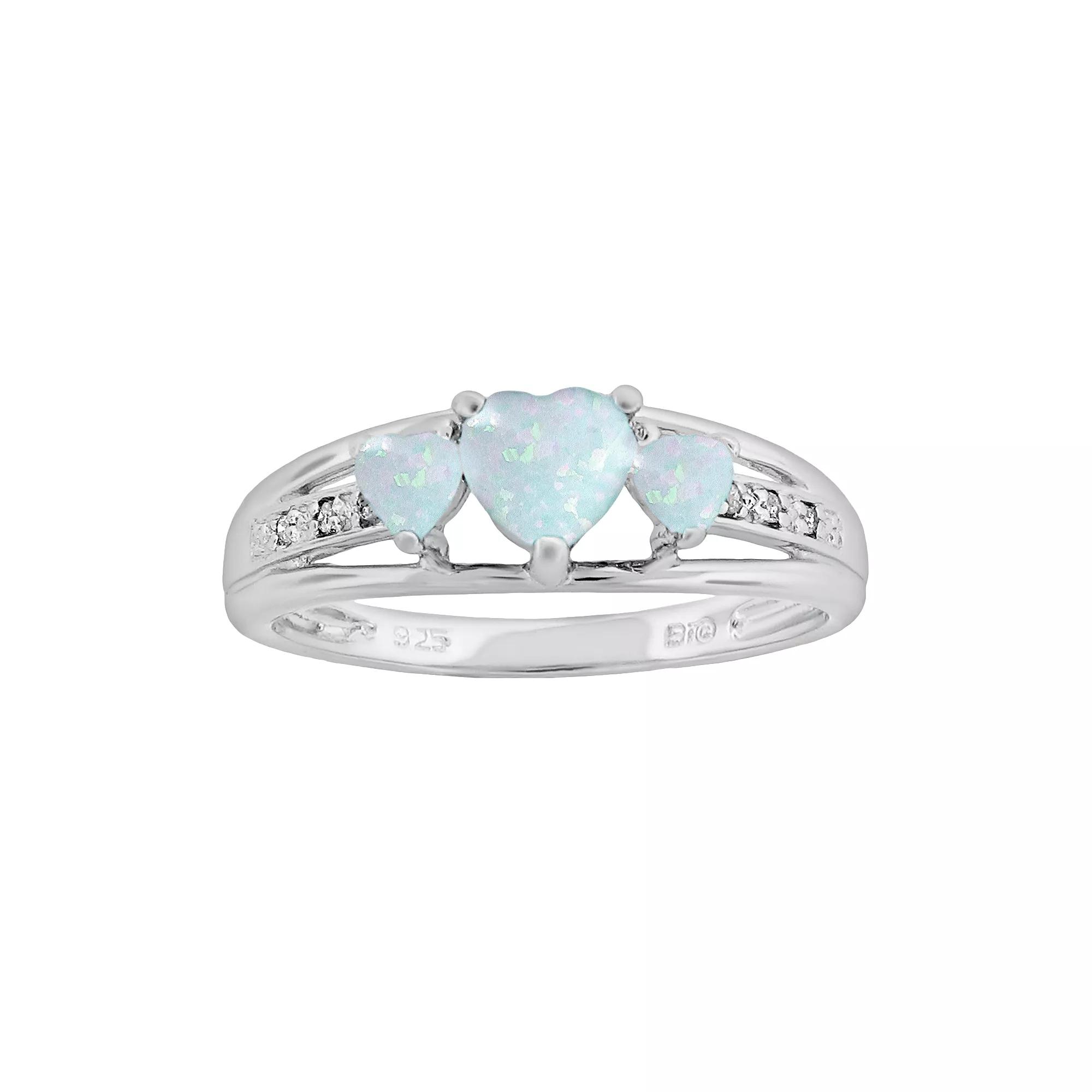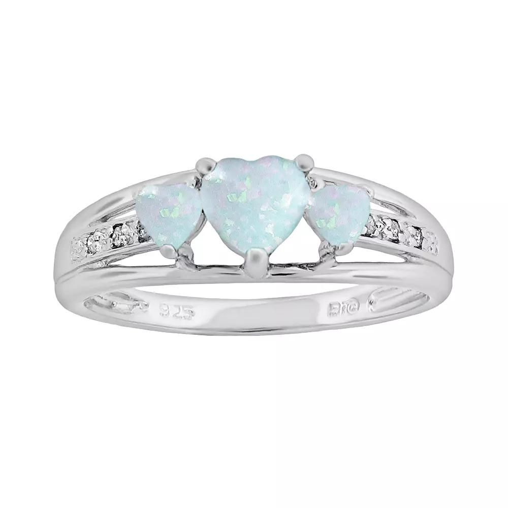 Radiant romance. Three heart-cut, lab-created opal stones illuminate this sterling silver ring. Pair this beautiful ring with a new pendant for a look you're sure to love. Diamond accents add a dazzling touch to the band. Details: .47-in. width Rhodium-plated sterling silver Image(s) may be enlarged to show detail. Diamond weights are approximate. Diamond total weights may vary between .01 and .08 ct. Some diamonds have fewer than 17 facets. Gemstones may have been treated to enhance their appearance. Special care may be required. Please visit our Gemstone Treatment & Special Care Guide for more information. Color: White. Gender: female. Age Group: adult.