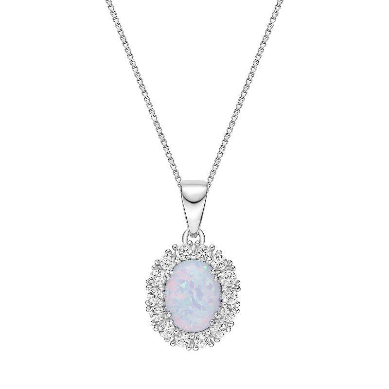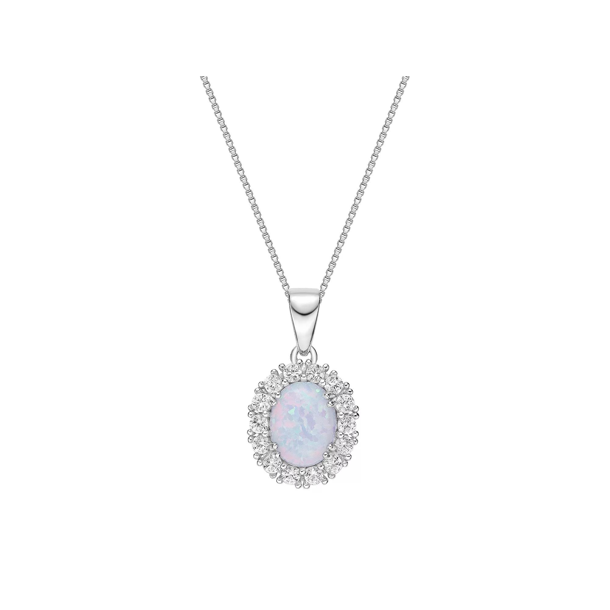 Sterling Silver Pendant Necklace with 9X7 Oval Created Opal and Created White Sapphire on 18" Cable Chain | Belk & Co Lab Created 1 Ct. T.w. Lab-Created Opal And 1/8 Ct. T.w. Lab-Created White Sapphire Pendant Necklace In Sterling Silver