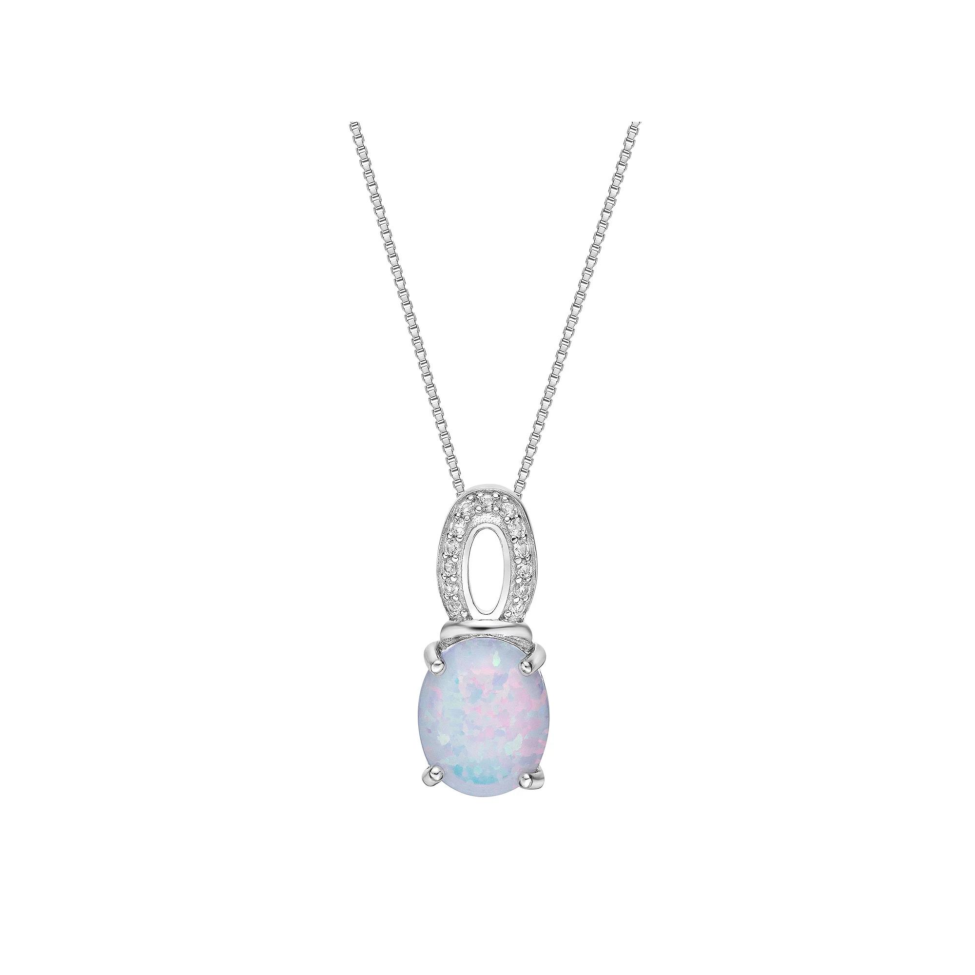 Sterling Silver Pendant Necklace with 11X9 Oval Created Opal and Created White Sapphire on 18" Box Chain | Belk & Co Lab Created 2 Ct. T.w. Lab-Created Opal And 1/8 Ct. T.w. Lab-Created White Sapphire Pendant Necklace In Sterling Silver