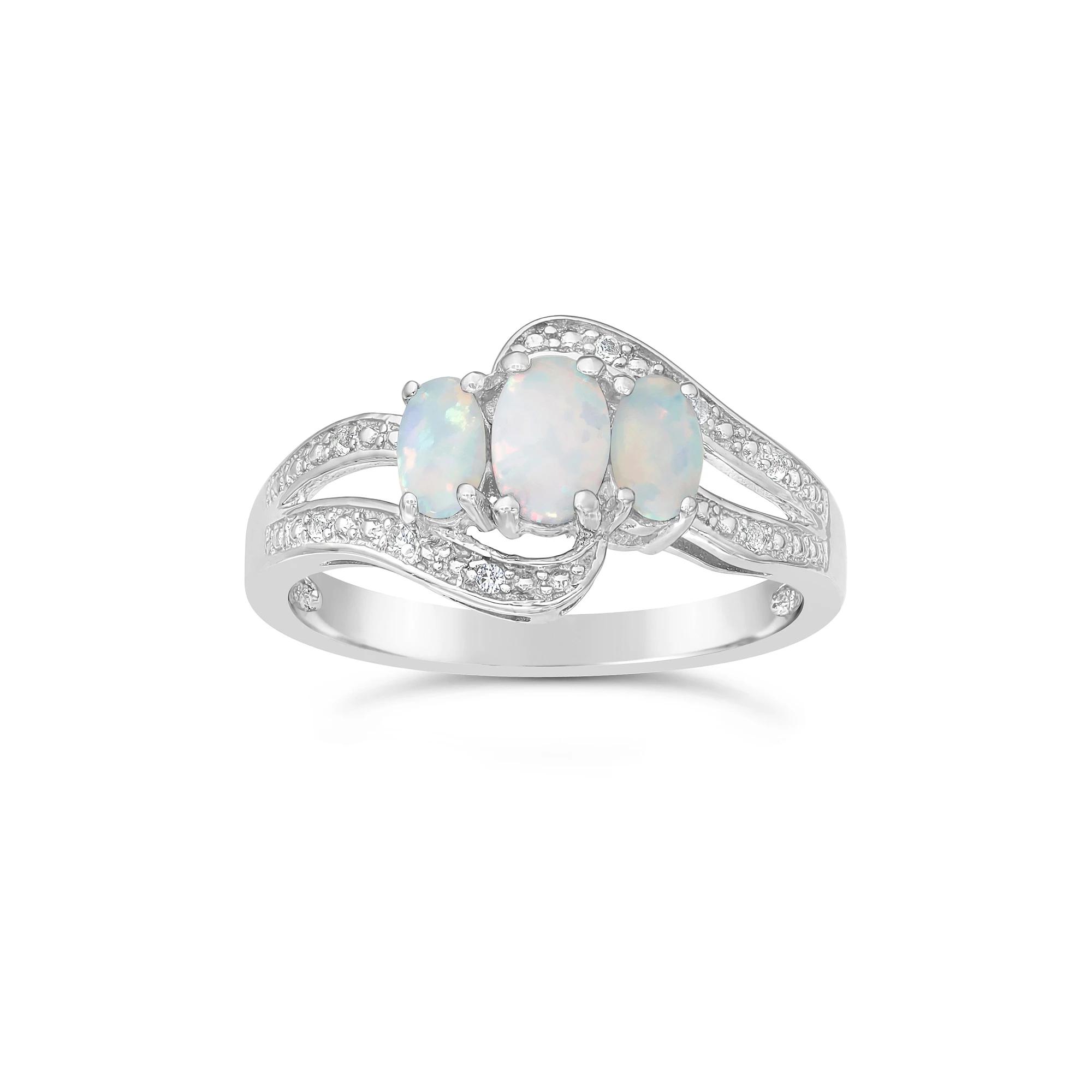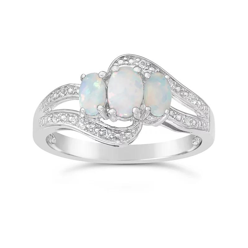 Featuring three lab-created opal stones illuminated by surrounding lab-created white sapphire accents, this sterling silver bypass ring is a stunning and elegant choice.RING DETAILS Width: 5 mm Metal: sterling silver Plating: rhodium Finish: polished Packaging: boxed STONE DETAILS Stone type: lab-created opal, lab-created white sapphire Total weight: 1/5 ct. Shape: oval, round Setting: prong Gemstones may have been treated to enhance their appearance. Special care may be required. Please visit our Gemstone Treatment & Special Care Guide for more information. Gender: female. Age Group: adult. Material: Sterling Silver|Rhodium.