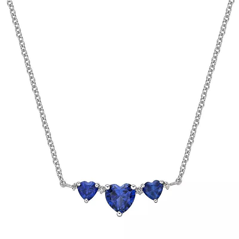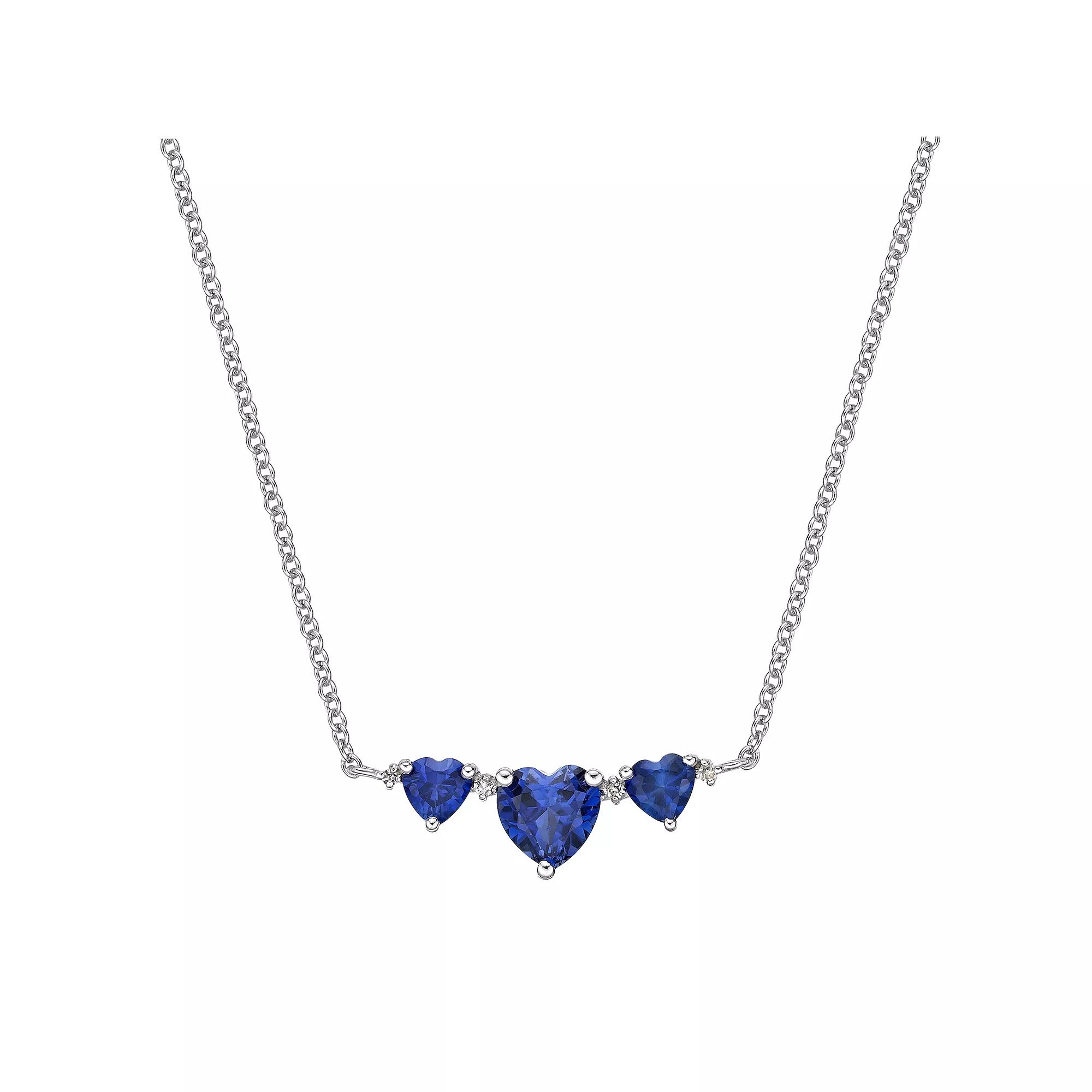 This gorgeous sterling silver diamond accent and lab-created sapphire pendant necklace is a must-add to your fine jewelry collection. This gorgeous sterling silver diamond accent and lab-created sapphire pendant necklace is a must-add to your fine jewelry collection. Pendant size: 0.28"L x 0.87"W Chain length: 18 in. Chain type: cable Metal: sterling silver Plating: rhodium Finish: polished Packaging: boxed Clasp: spring-ringSTONE DETAILS Stone type: lab-created sapphire Total weight: 1 ct. Center stone size: 6 mm x 6 mm Shape: heart Setting: prongDIAMOND DETAILS Total weight: less than 1/10 ct. Shape: round Setting: prong Diamond weights are approximate. Diamond total weights may vary between .01 and .08 ct. Some diamonds have fewer than 17 facets. Gemstones may have been treated to enhance their appearance. Special care may be required. Please visit our Gemstone Treatment & Special Care Guide for more information. Image(s) may be enlarged to show detail. Please note, due to the high value of this item, a signature may be required upon delivery. Size: 18". Color: Blue. Gender: female. Age Group: adult.