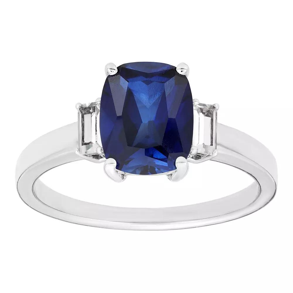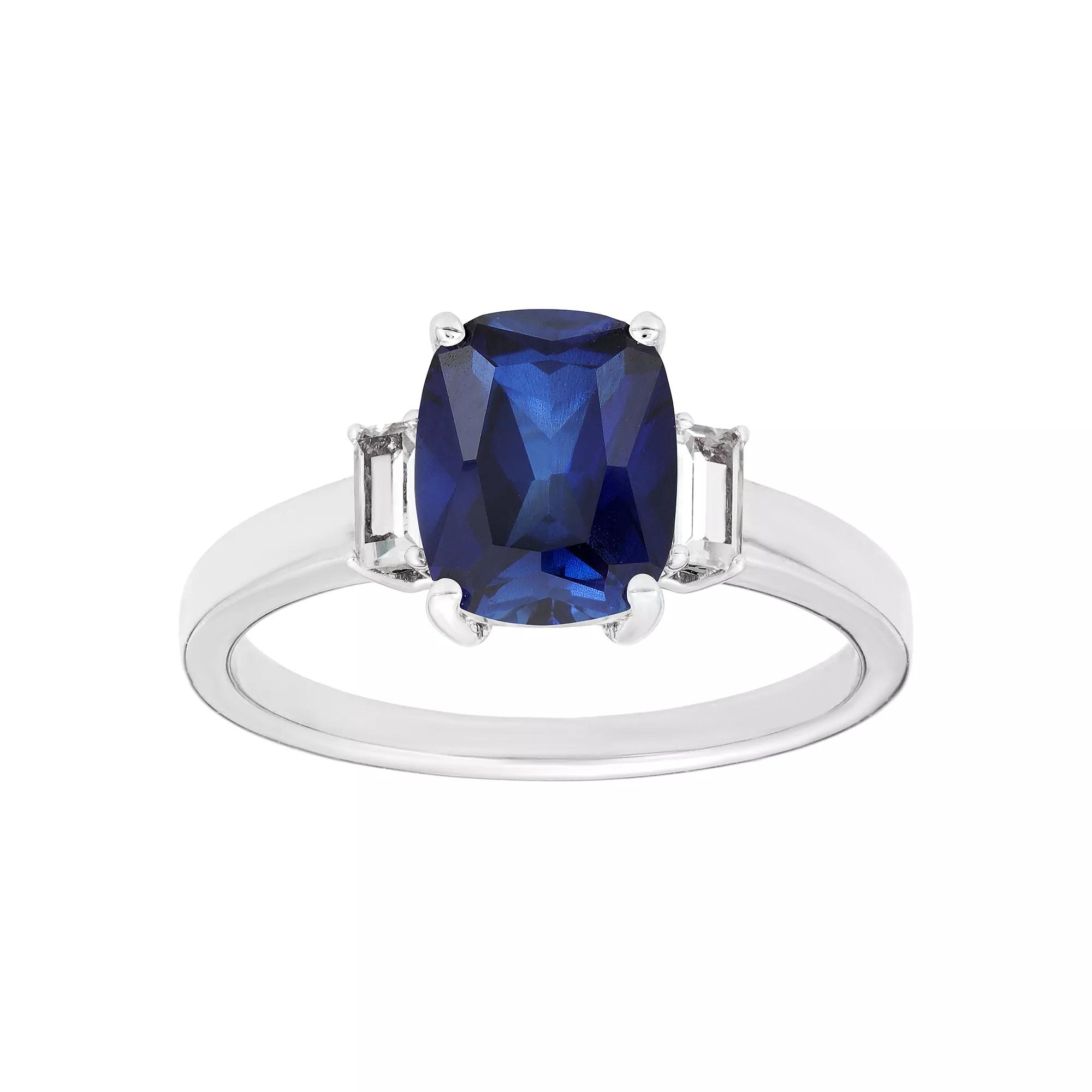 This gorgeous sterling silver lab-created sapphire and lab-created white sapphire accent ring is a must-add to your fine jewelry collection. This gorgeous sterling silver lab-created sapphire and lab-created white sapphire accent ring is a must-add to your fine jewelry collection. Width: 9 mm Metal: sterling silver Plating: rhodium Finish: polished Packaging: boxedSTONE DETAILS Stone type: lab-created sapphire Total weight: 2 7/8 ct. Center stone size: 9 mm x 7 mm Shape: cushion cut Setting: prong Gemstones may have been treated to enhance their appearance. Special care may be required. Please visit our Gemstone Treatment & Special Care Guide for more information. Please note, due to the high value of this item, a signature may be required upon delivery. Color: Blue. Gender: female. Age Group: adult.