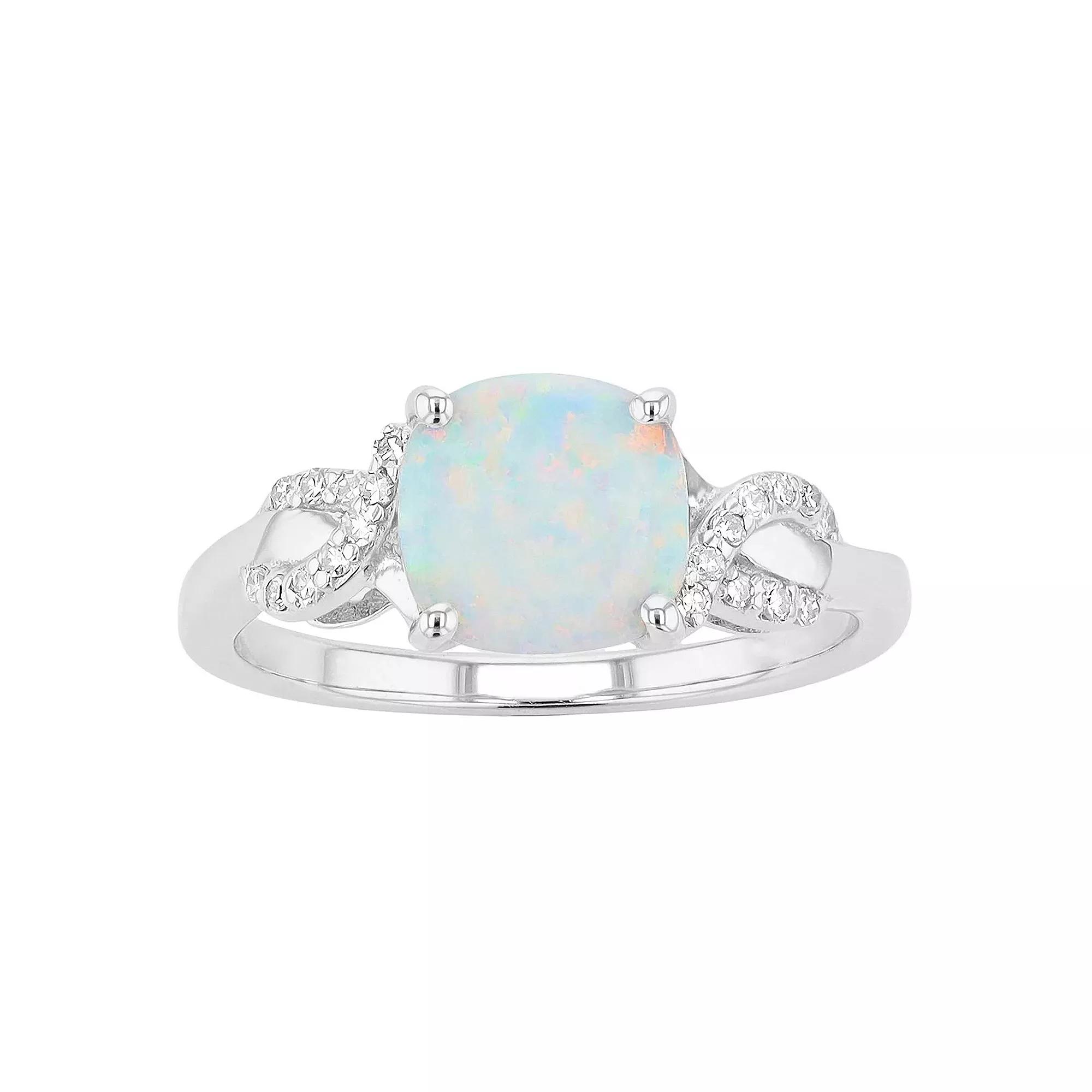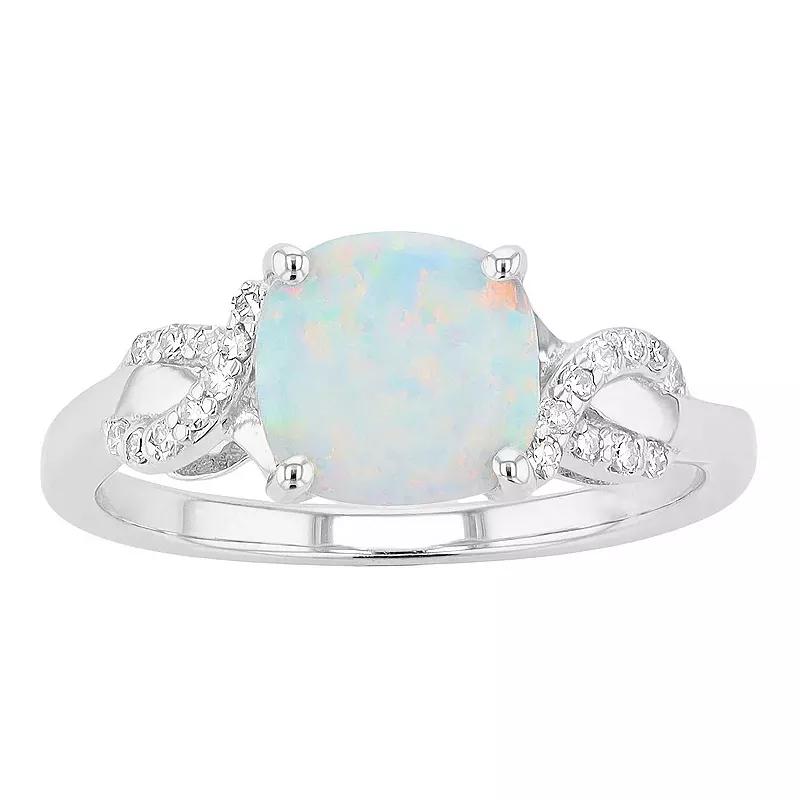 You're sure to captivate every time you wear this beautiful lab-created white opal and diamond ring. Width: 8 mm Metal: sterling silver Plating: rhodium Finish: polished Packaging: boxedSTONE DETAILS Stone type: lab-created white opal Total weight: 1 ct. Center stone size: 8 mm Shape: cushion cutDIAMOND DETAILS Total weight: 1/10 ct. Shape: round Setting: prong Gemstones may have been treated to enhance their appearance. Special care may be required. Please visit our Gemstone Treatment & Special Care Guide for more information. Diamond weights are approximate. Diamond total weights may vary between .01 and .08 ct. Some diamonds have fewer than 17 facets. Image(s) may be enlarged to show detail. Please note, due to the high value of this item, a signature may be required upon delivery. Gender: female. Age Group: adult.