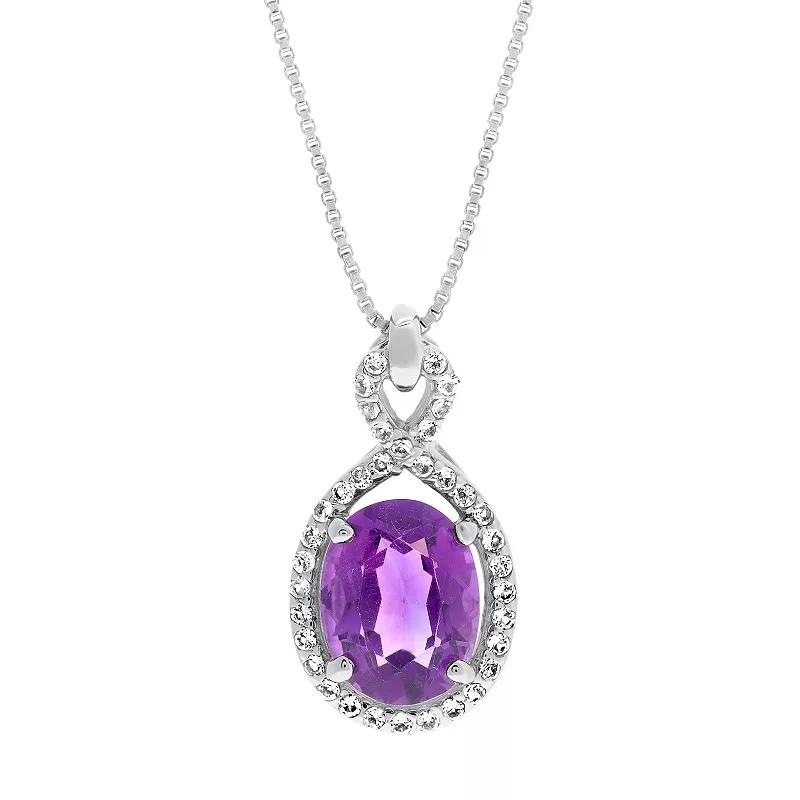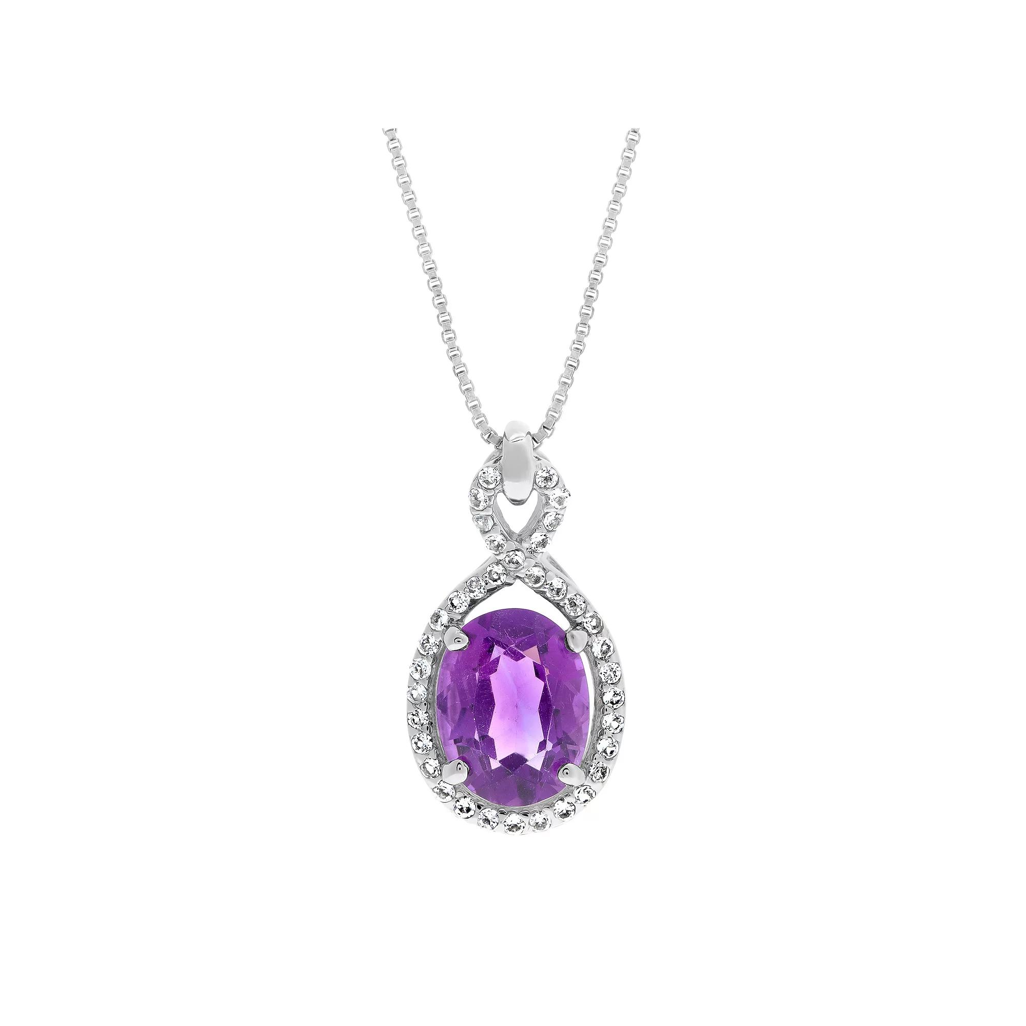 This gorgeous sterling silver white topaz accent and amethyst pendant necklace is a must-add to your fine jewelry collection. This gorgeous sterling silver white topaz accent and amethyst pendant necklace is a must-add to your fine jewelry collection. Pendant size: 0.67L x 0.39W Chain length: 18 in. Chain type: box Clasp: spring-ring Metal: sterling silver Plating: rhodium Finish: polished Packaging: boxedSTONE DETAILS Stone type: amethyst, white topaz Total weight: 1 5/8 ct. Center stone size: 9 mm x 7 mm Shape: oval Setting: prong Gemstones may have been treated to enhance their appearance. Special care may be required. Please visit our Gemstone Treatment & Special Care Guide for more information. Please note, due to the high value of this item, a signature may be required upon delivery. Size: 18. Color: Purple. Gender: female. Age Group: adult.