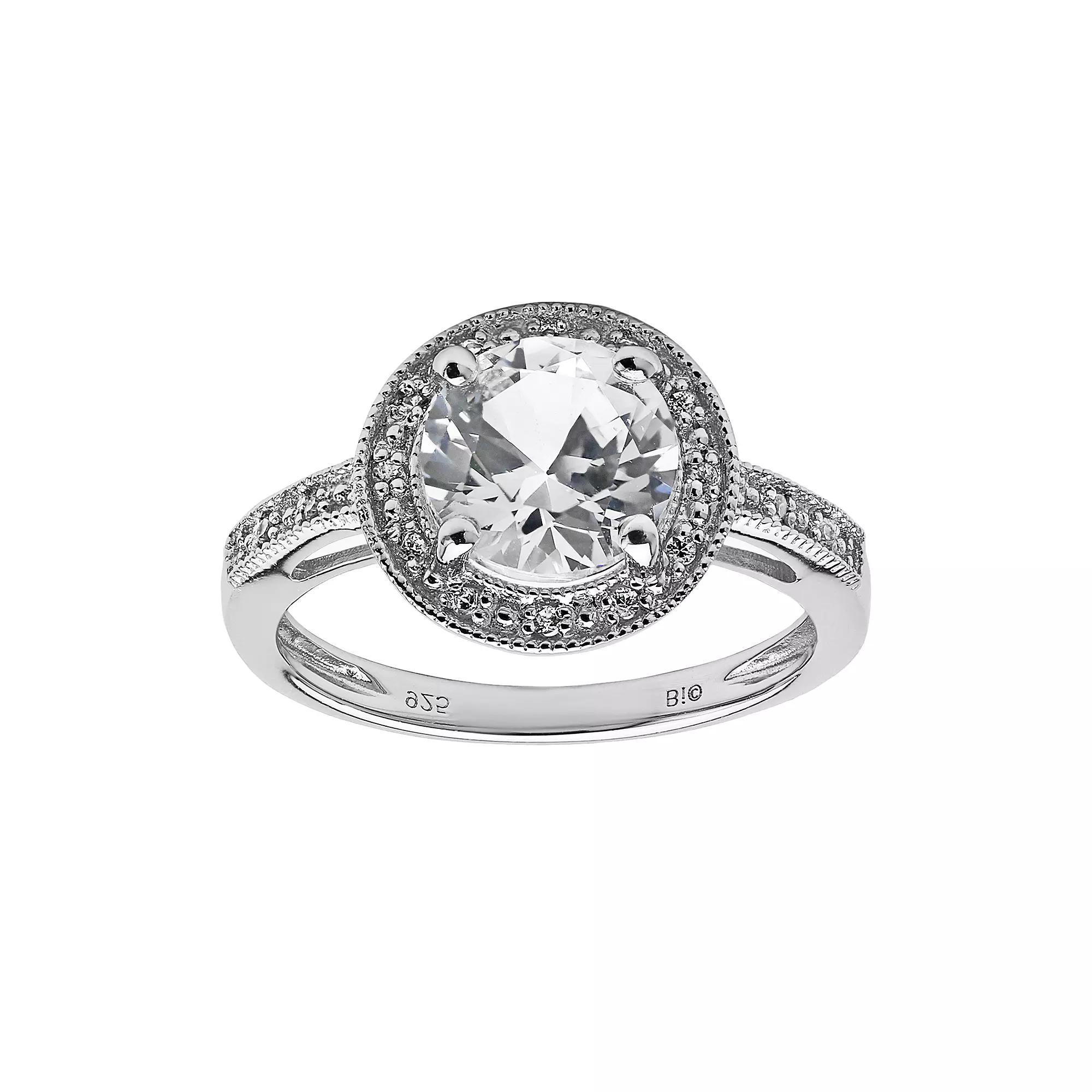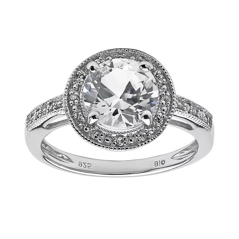 Showcase your sophisticated style with this classic diamond accent round frame ring.Ring Details: Width: 10-mm Metal: rhodium-plated sterling silverDiamond Details: Carat total weight: less than 1/10 Cut: round Color: I-J Clarity: I2-I3 Setting: prongStone Details: Stone type: genuine white topaz & lab-created white sapphire Cut: round Setting: prongImage(s) may be enlarged to show detail.Diamond weights are approximate. Diamond total weights may vary between .01 and .08 ct. Some diamonds have fewer than 17 facets.Gemstones may have been treated to enhance their appearance. Special care may be required. Please visit our Gemstone Treatment & Special Care Guide for more information. Gender: female. Age Group: adult.