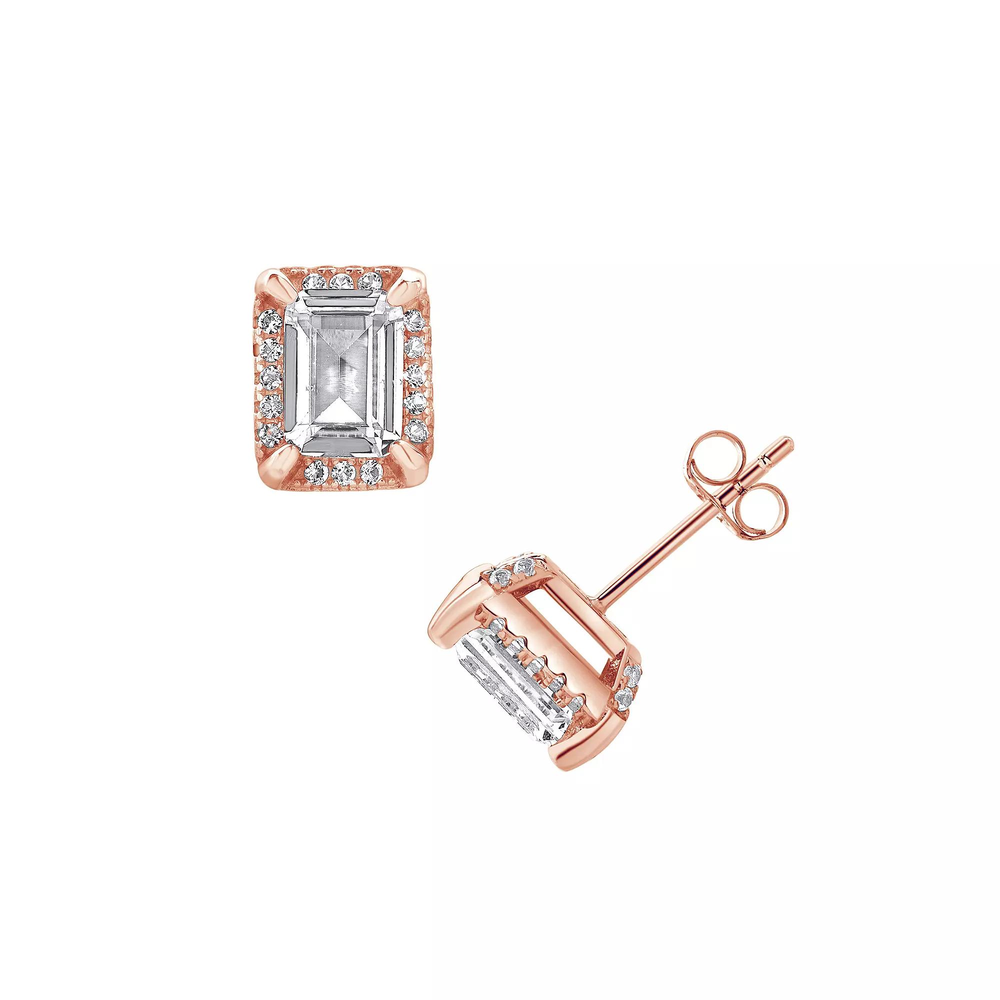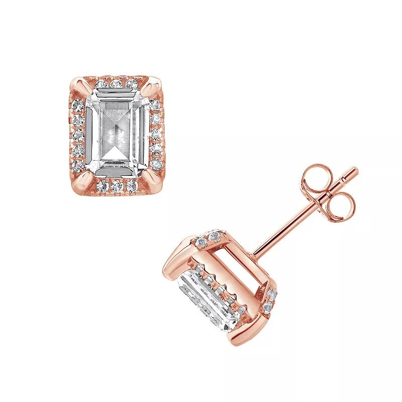 Complement your look with these dazzling Gemstone Brilliance Lab-Created White Sapphire Stud Earrings. Click on this JEWELRY & WATCHES GUIDE to learn about fit, styles, materials and more! Complement your look with these dazzling Gemstone Brilliance Lab-Created White Sapphire Stud Earrings. Click on this JEWELRY & WATCHES GUIDE to learn about fit, styles, materials and more! FEATURES Length: 8.80 mm Backings: post Nickel free Metal: sterling silver Plating: rhodium, 14k gold flash, 14k rose gold flash Finish: polished Packaging: boxedSTONE DETAILS Stone type: lab-created white sapphire Center stone size: 7.0 mm x 5.0 mm Shape: emerald cut Setting: prong Gemstones may have been treated to enhance their appearance. Special care may be required. Please visit our Gemstone Treatment & Special Care Guide for more information. Size: One Size. Color: Rose Tone. Gender: female. Age Group: adult.