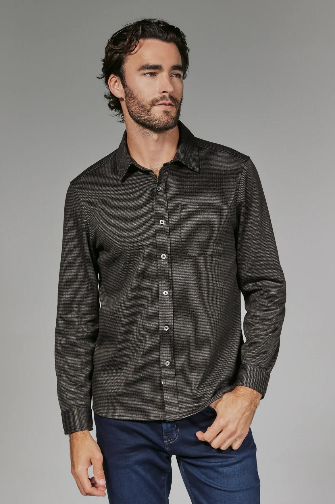 A double knit 4-way stretch houndstooth pattern shirt crafted with incredible softness and drape. Features front patch pocket and adjustable cuffs.