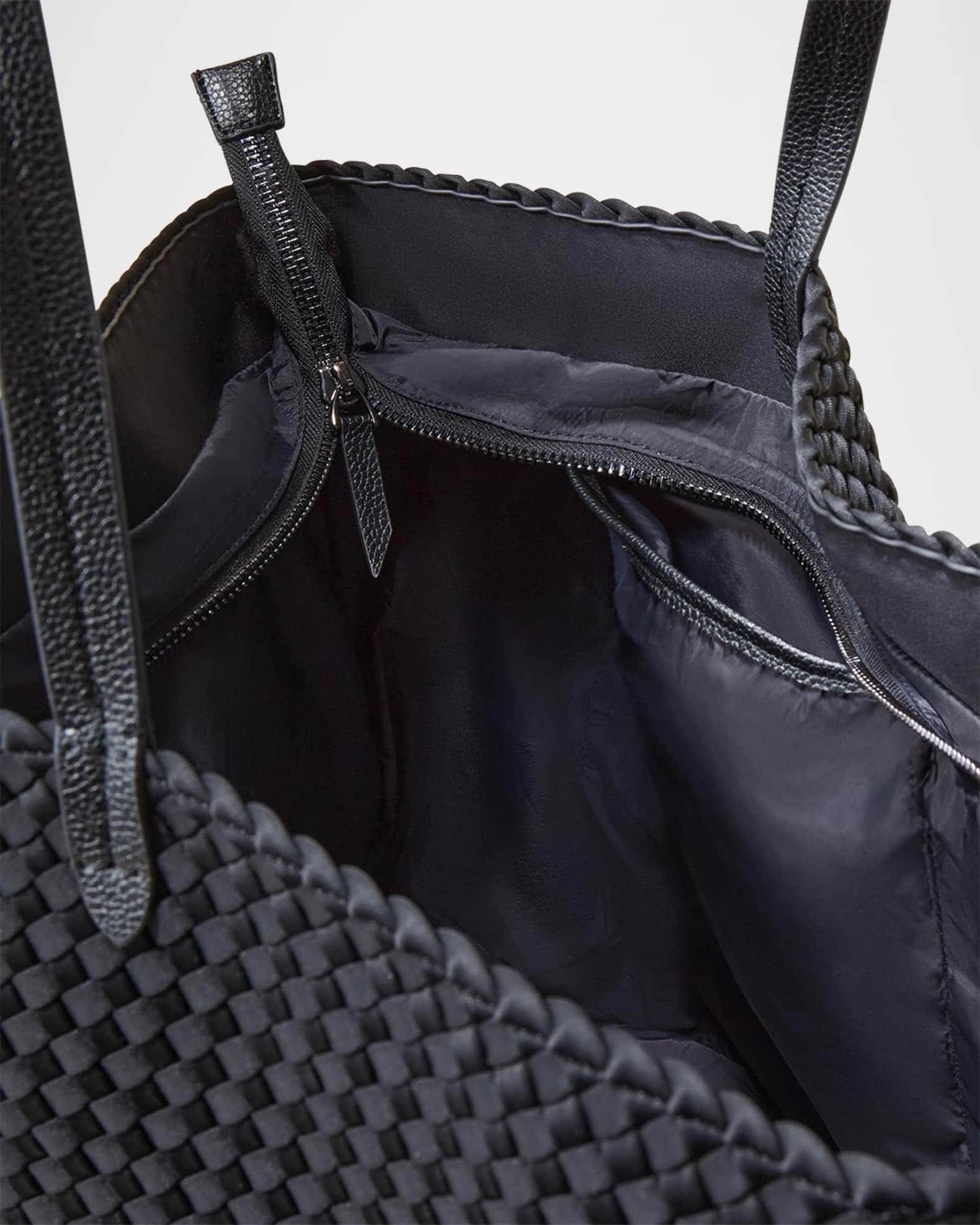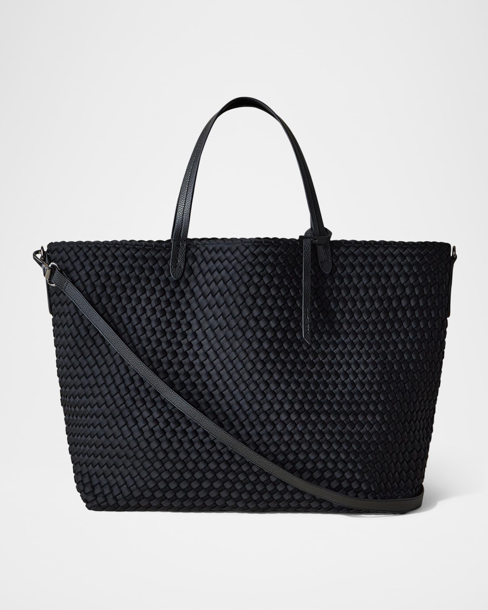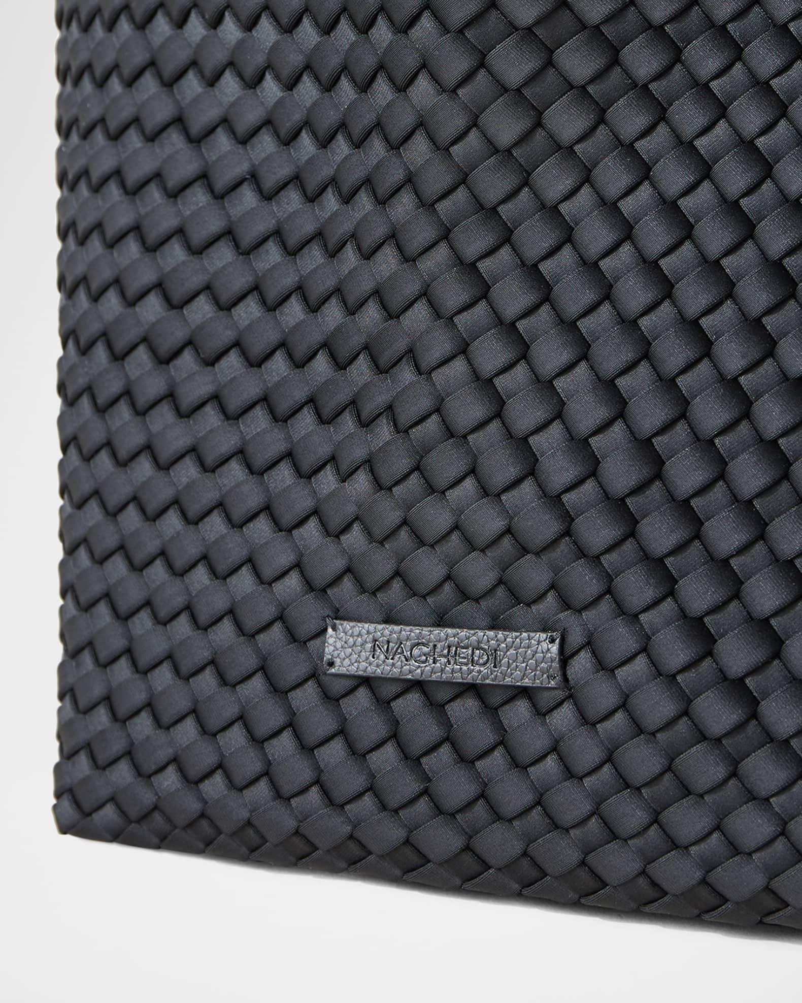 Perfect for gym, work, baby, and of course, travel. Handwoven from neoprene, Naghedi's Jetsetter large tote is both elegant and durable. Detachable, adjustable strap included. NAGHEDI "Geneva" elegant and durable weekender bag in woven neoprene Top handles Detachable, adjustable shoulder strap Can be worn as a top handle or shoulder bag Zip top closure Interior, one slip pocket Wipe-clean nylon lining Approx. 13"H x 24"W x 9"D Spot clean Imported