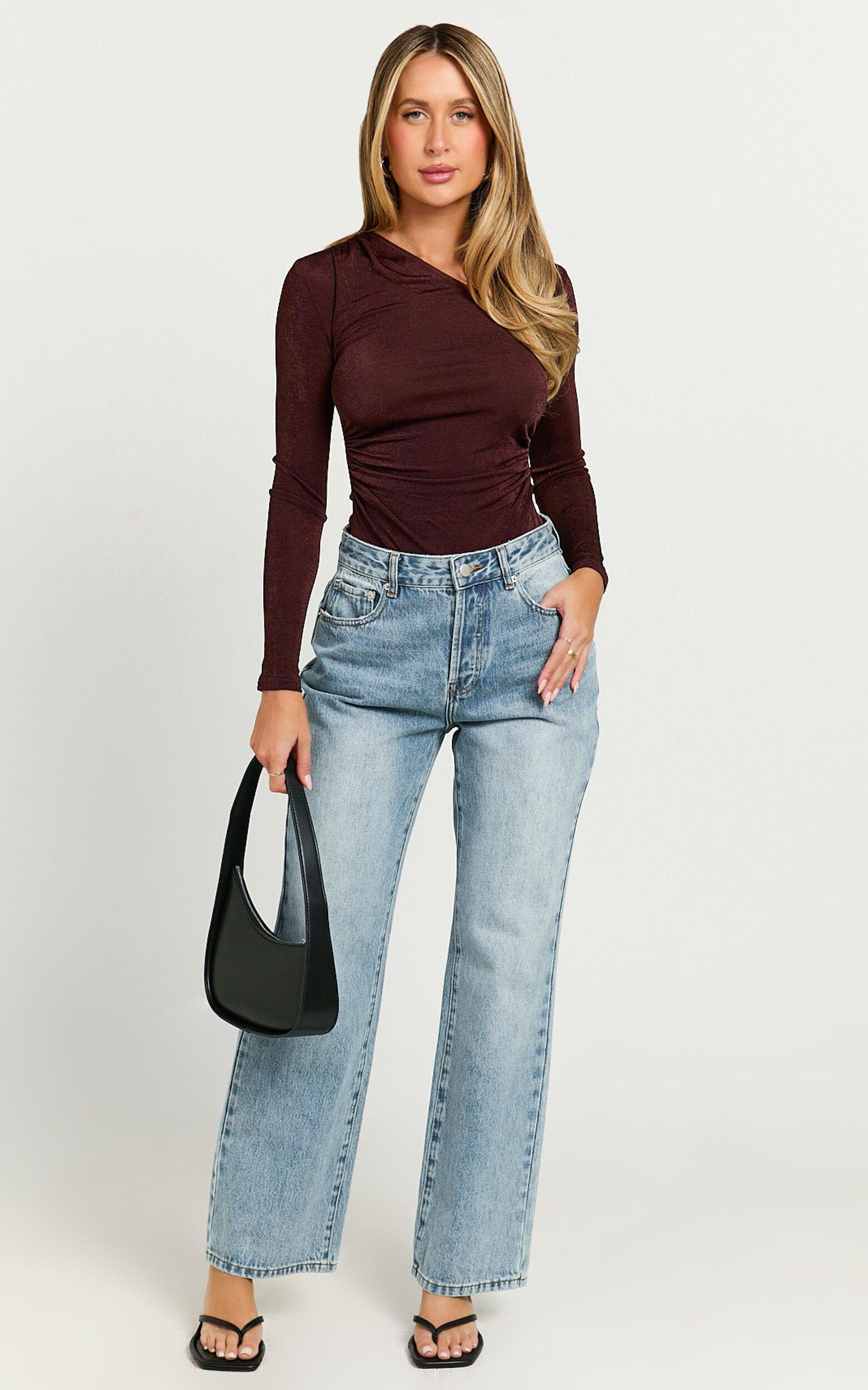Slide into your new fashion favorite with the Genie Bodysuit - a long-sleeve asymmetrical neckline bodysuit in a decadent chocolate color. This piece isn't just a bodysuit; it's a statement. Crafted with ribbed jersey that contours elegantly to your body, it's designed in a rich polyester blend that feels as luxurious as it looks.Product Details:Asymmetrical necklineLong sleeveRibb Jersey fabricPull on stylePerfect for partySize and FitSize S / 8 length: 76cm / 29.92inMaterial and Care90% Polyester, 10% SpandexLow Stretch