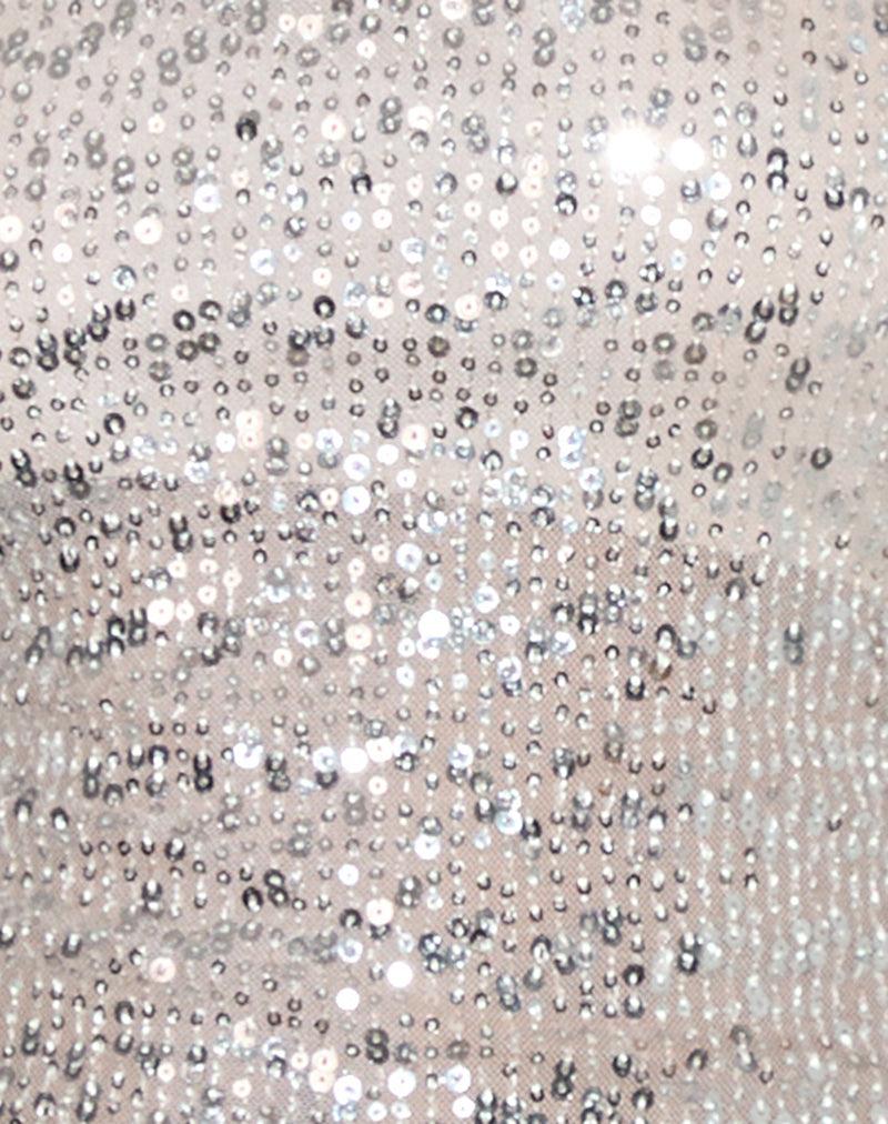 The Gentaya top in neutral gauzy sequin fabric. Bandeau style top with longline asymmetrical hem. Finished with frill along the hemline. Bust is lined. Pair with our Nidya skirt. MODEL WEARS SIZE: EXTRA SMALL - MODEL HEIGHT:5’7
