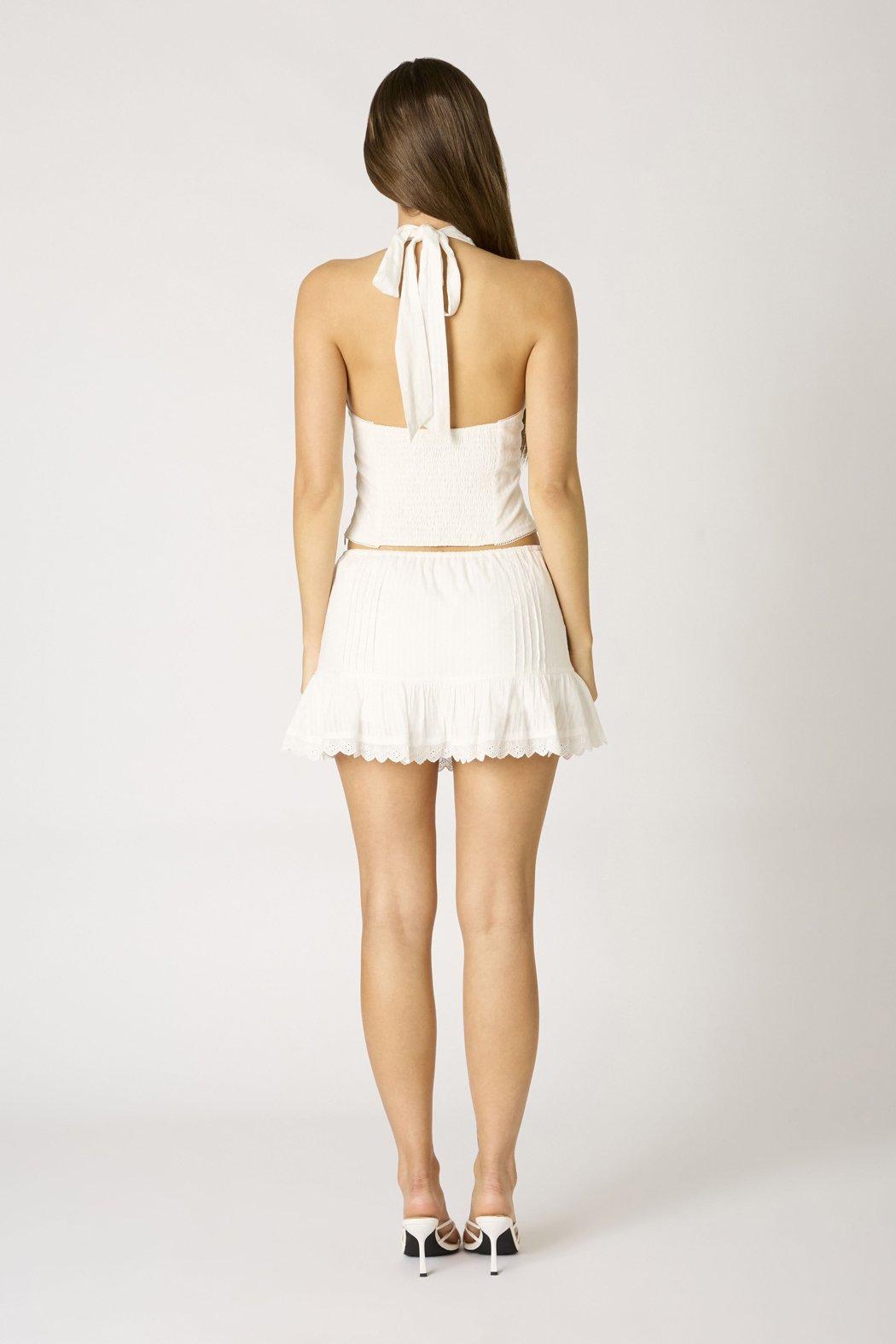 This flirty little halter top features a plunging v-neckline, delicate button-up front, and subtle pintuck detailing. Pair with the 99 Mini Skirt for a fun summery look.