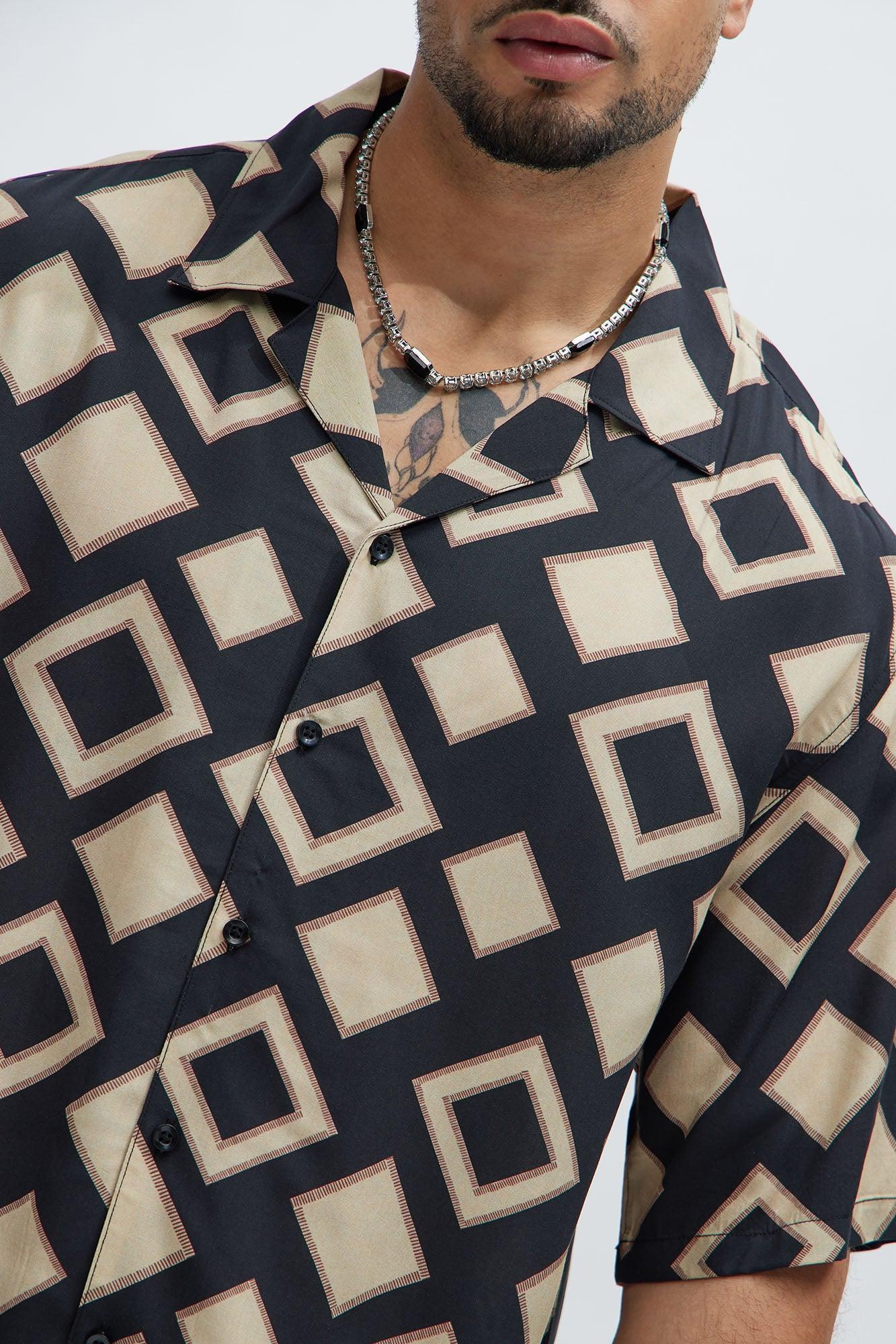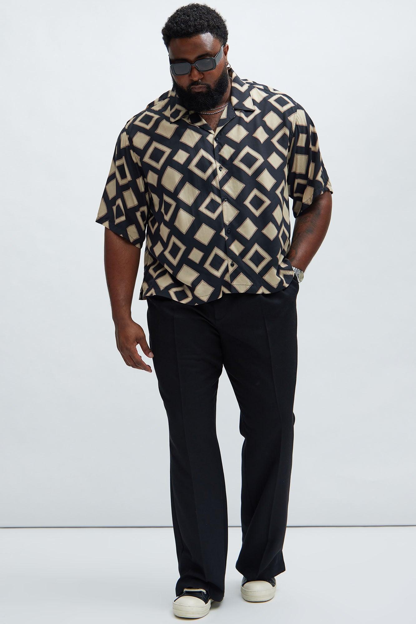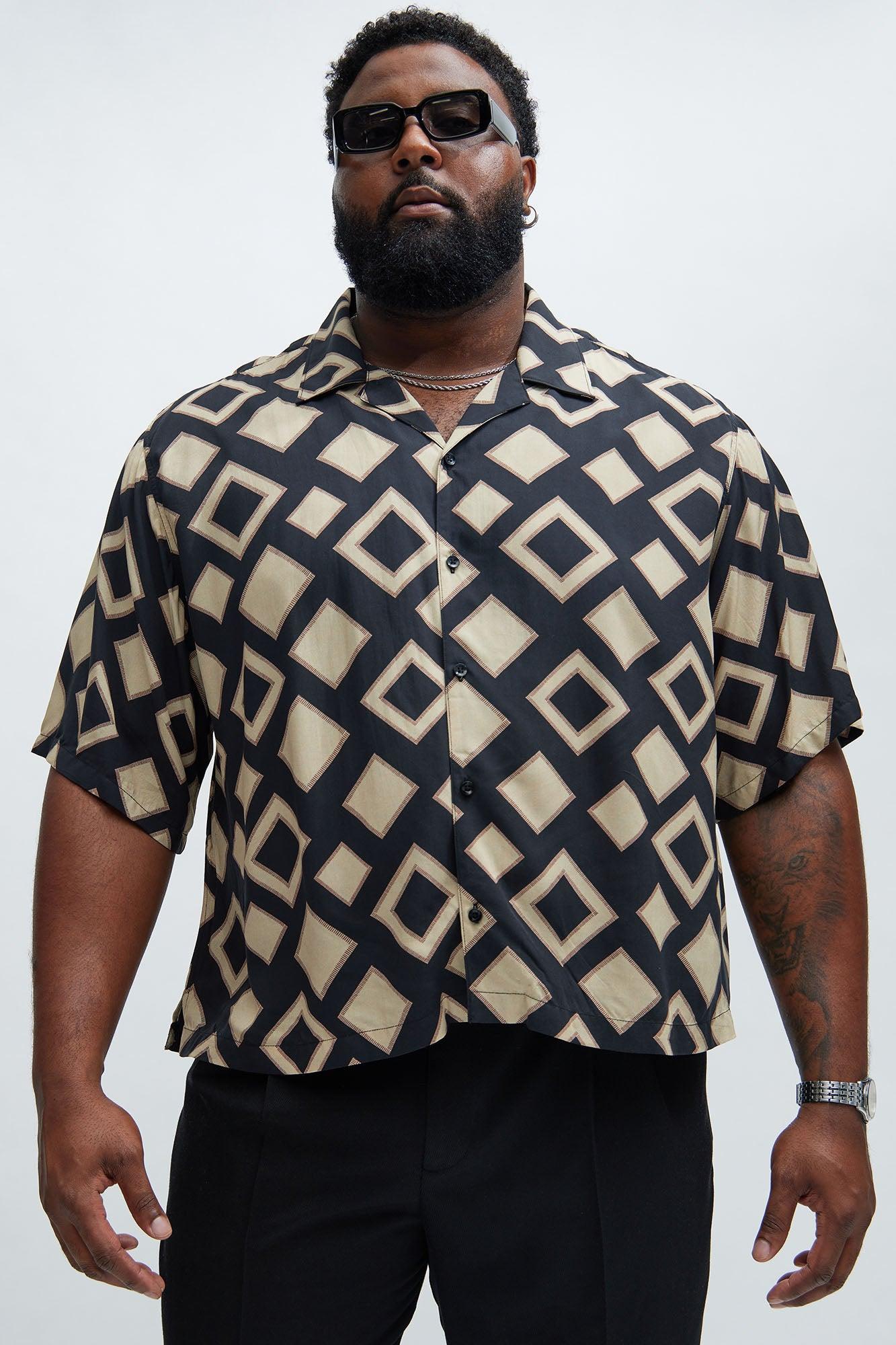 Available In Black/Brown. Fold Down Collar Front Button Closure Short Sleeve Bottom Side Slit Disclaimer: Pattern Placement May Vary. 100% Viscose Imported California Proposition 65 WARNING: Cancer and Reproductive Harm - www.P65Warnings.ca.gov.