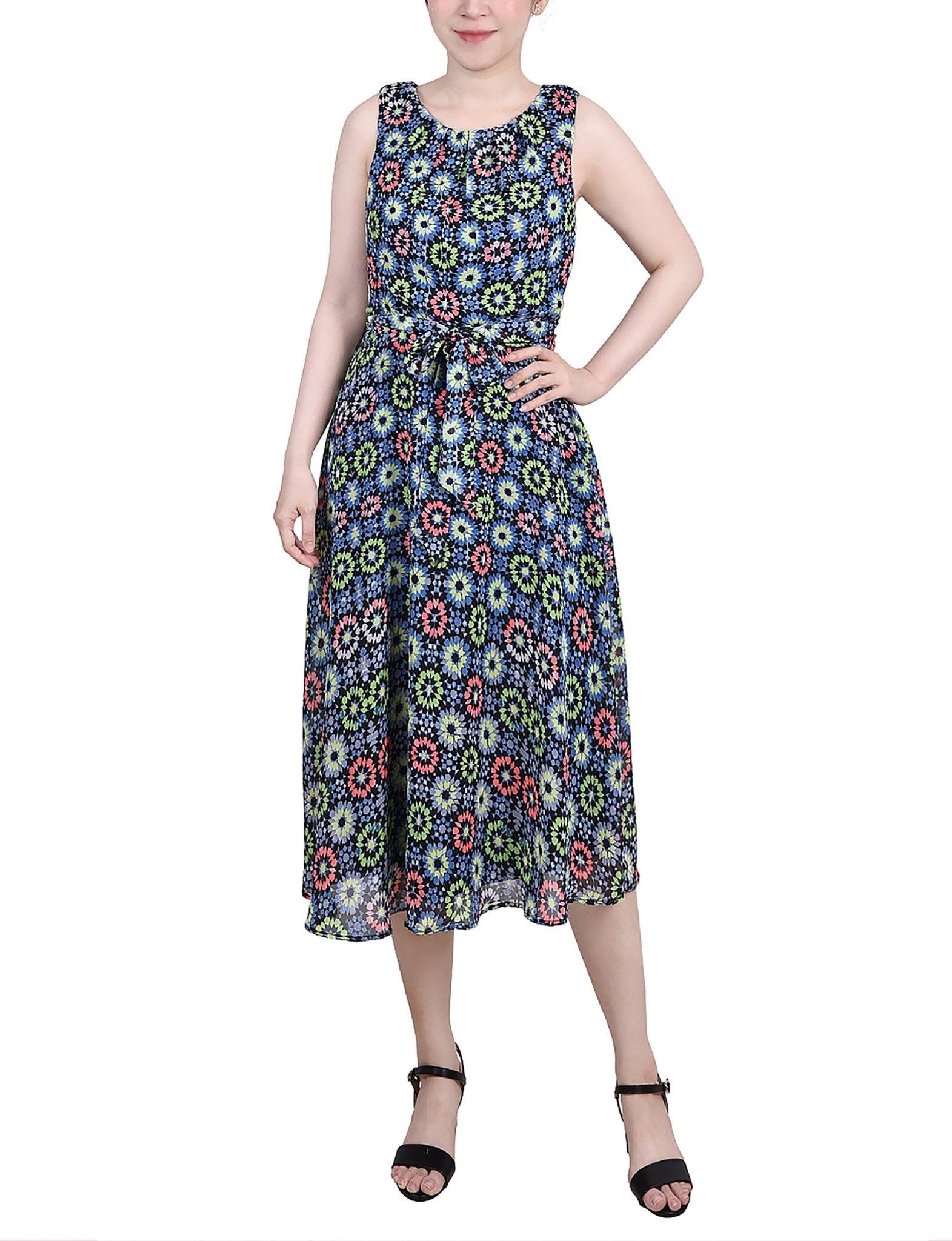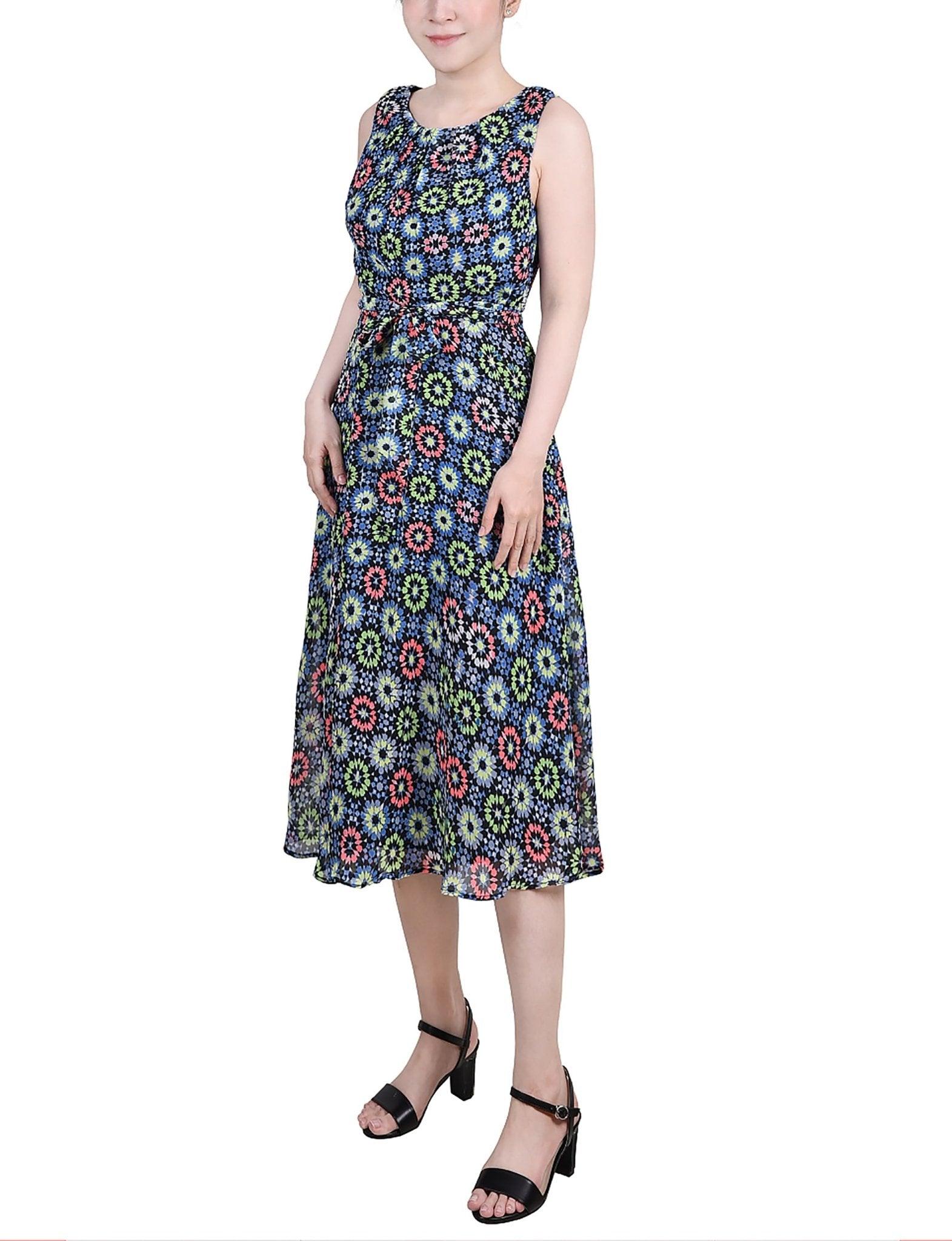 Geo Hippe Peasant Sleeveless Chiffon Belted Dress - Petite