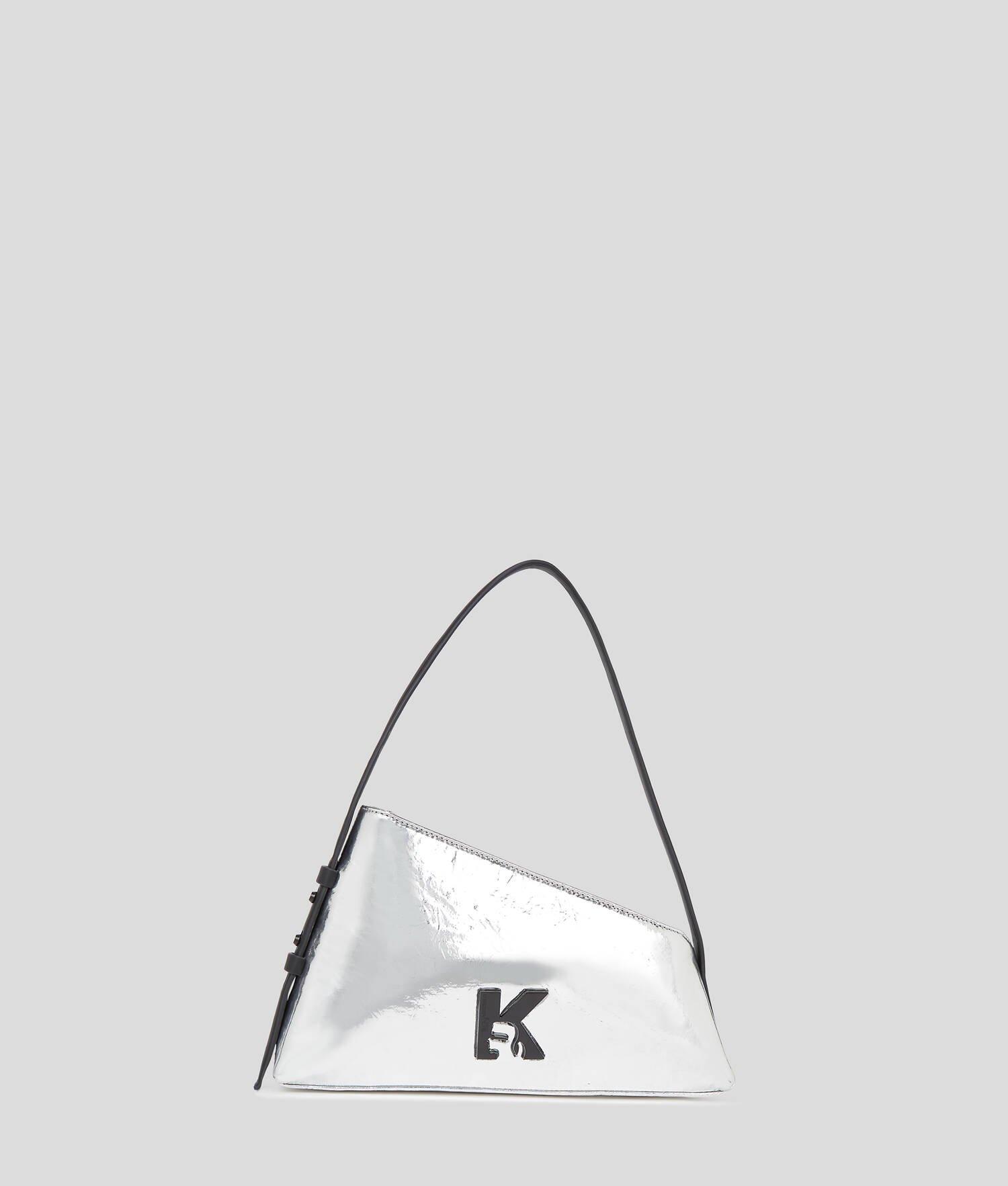 A standout geometric silhouette defines this statement shoulder bag, featuring a dazzling mirror-effect finish. Complemented by bold K-logo hardware, it boasts a zip-top opening and a contrasting adjustable strap for enhanced functionality, making it the perfect party-ready piece.