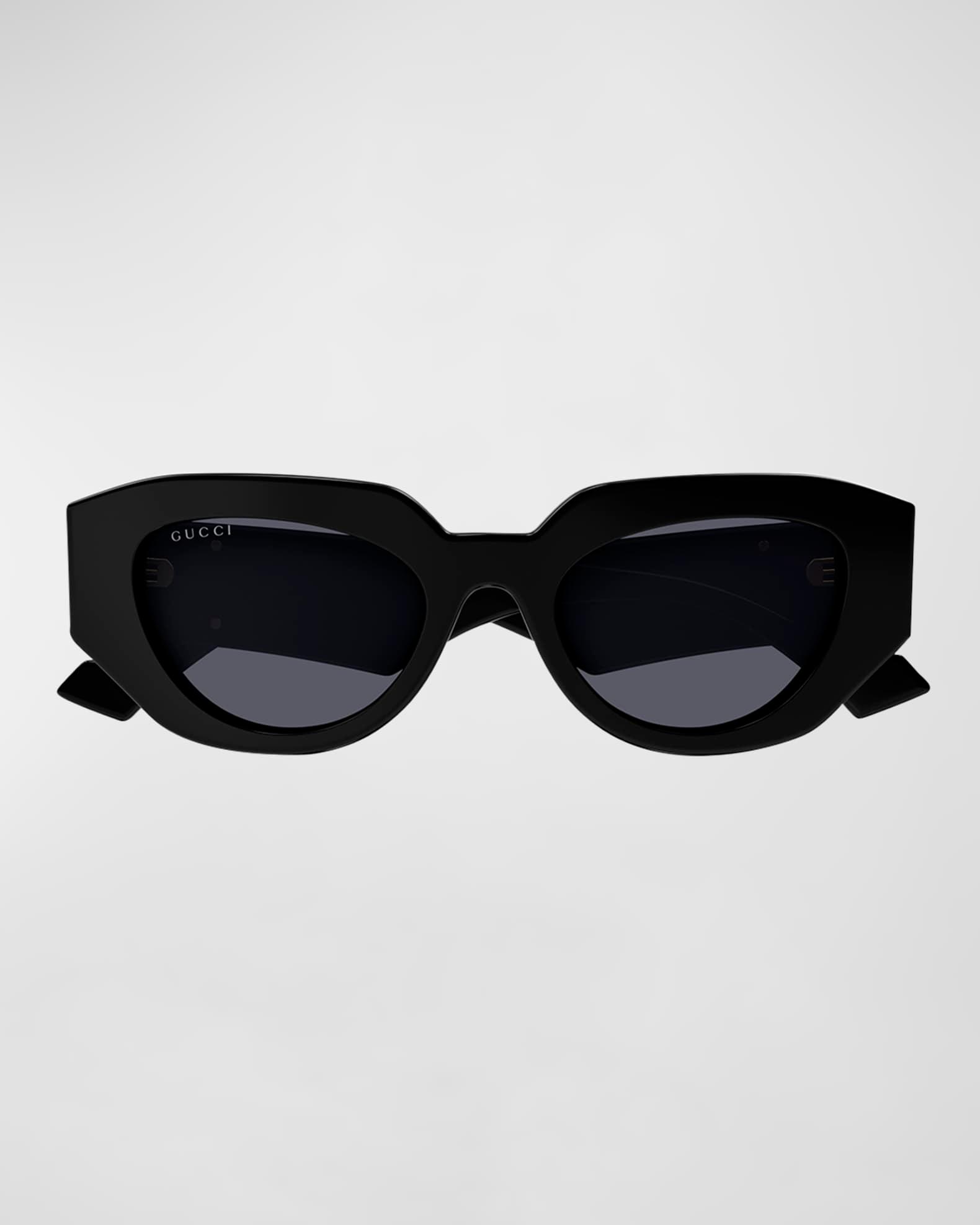 Gucci "GG1421S" angular butterfly sunglasses in acetate Lens/bridge/temple (in mm): 51-20-145 Solid lenses; logo on corner Oversized GG logo on temples Wide, tapered arms 100% UVA/UVB protection Made in Italy Proposition 65 warning for California residents This product contains perfluoroalkyl and polyfluoroalkyl substances (PFAS). For more information, please visit the manufacturer’s website.