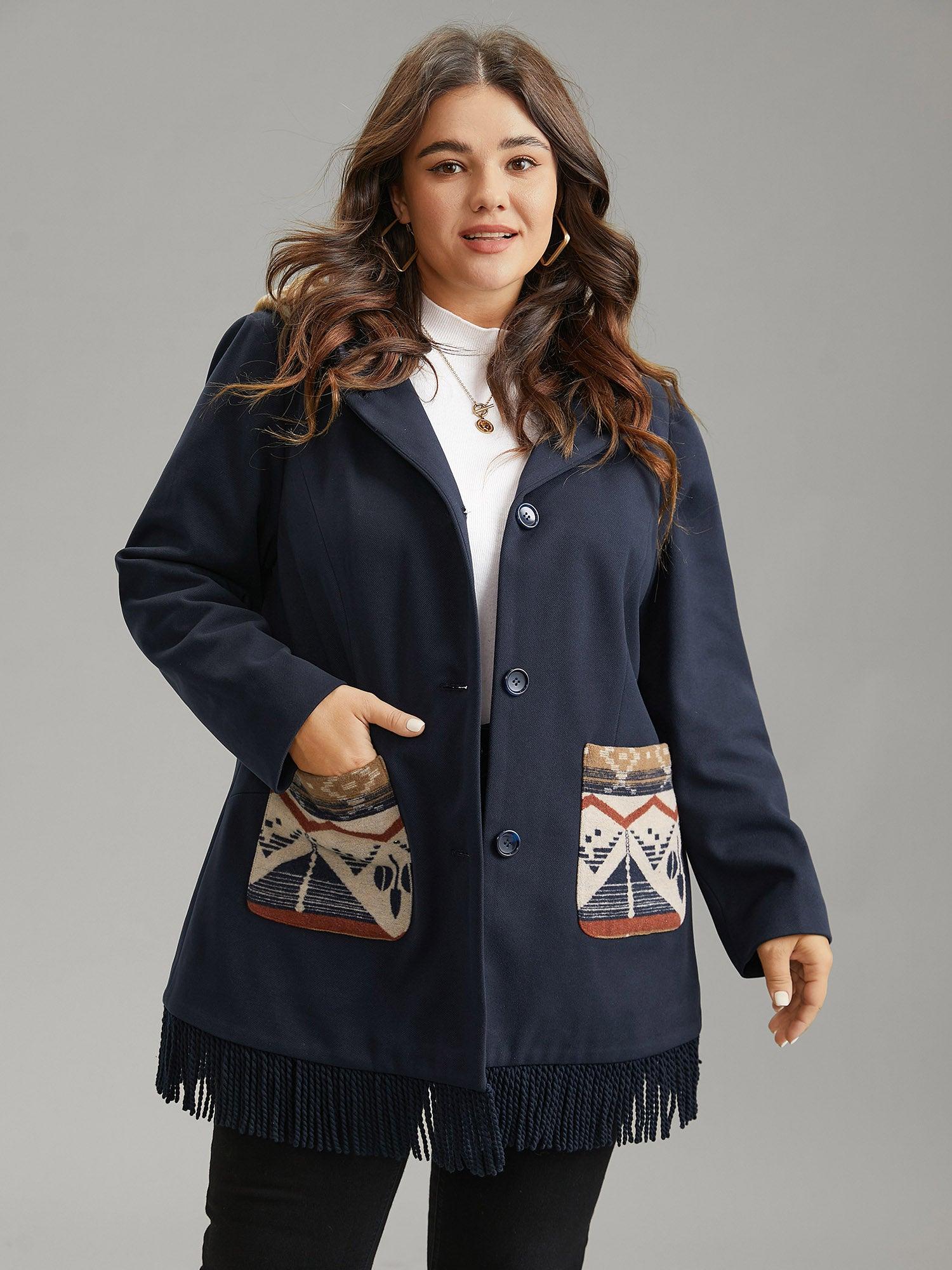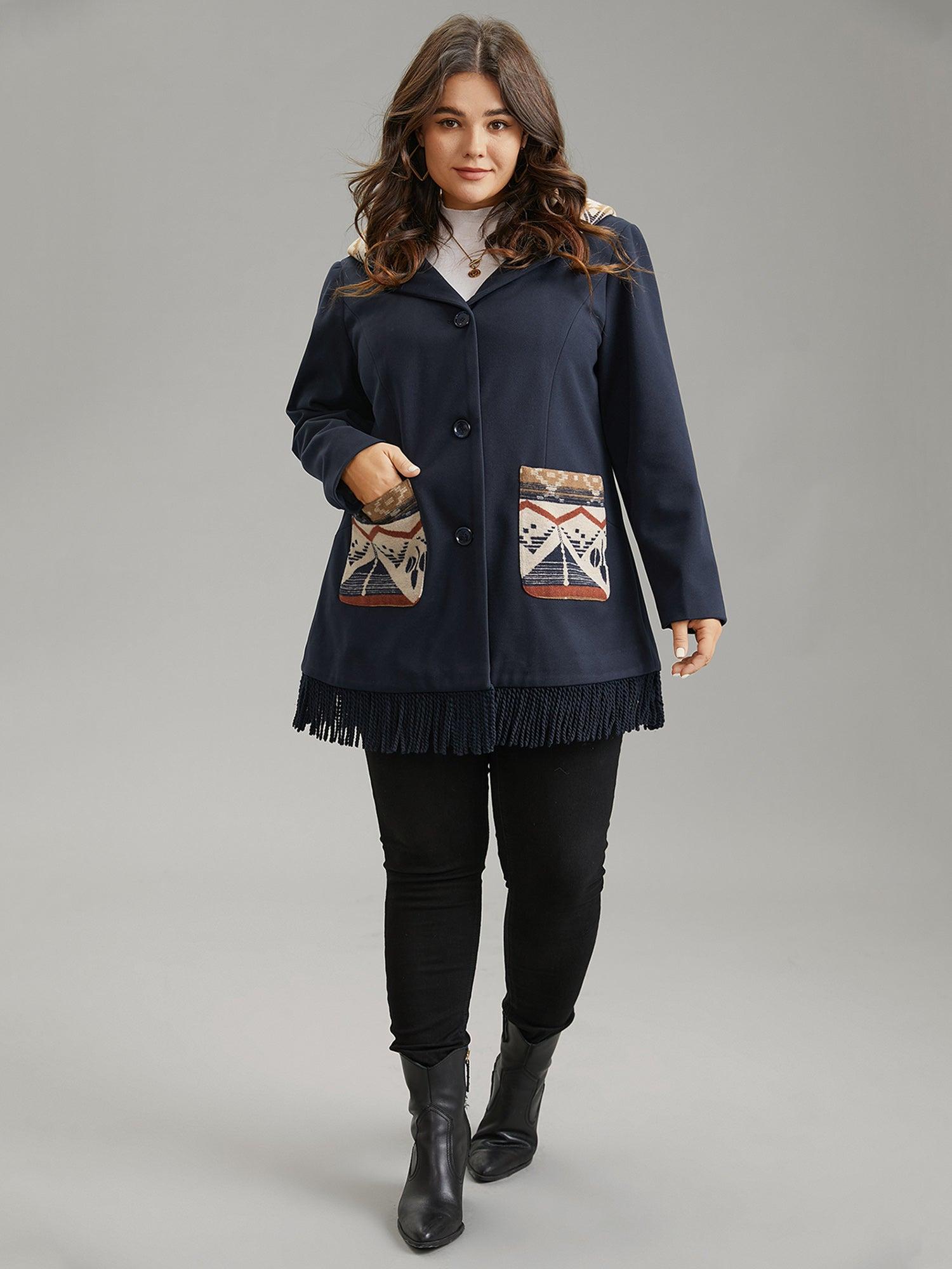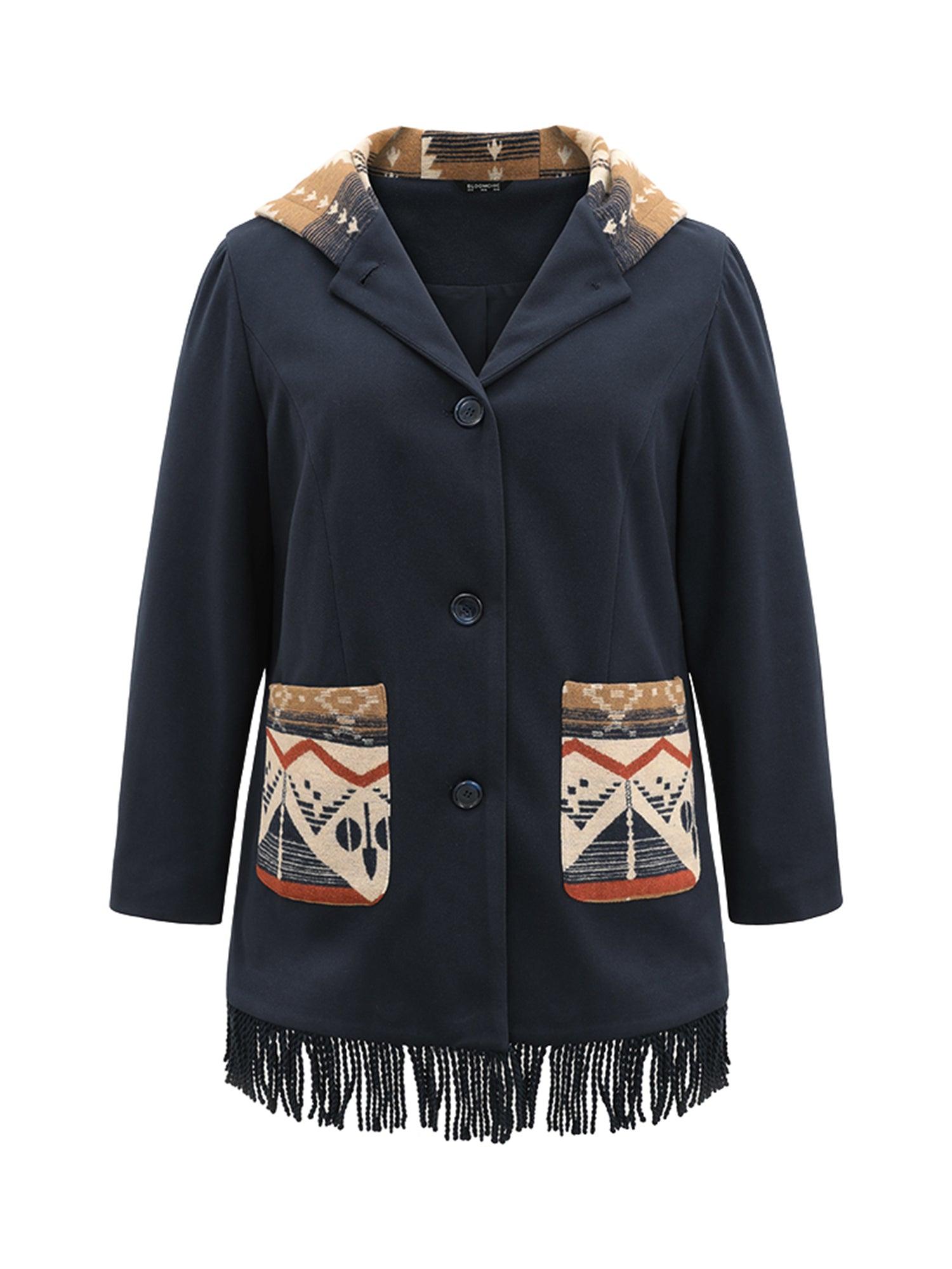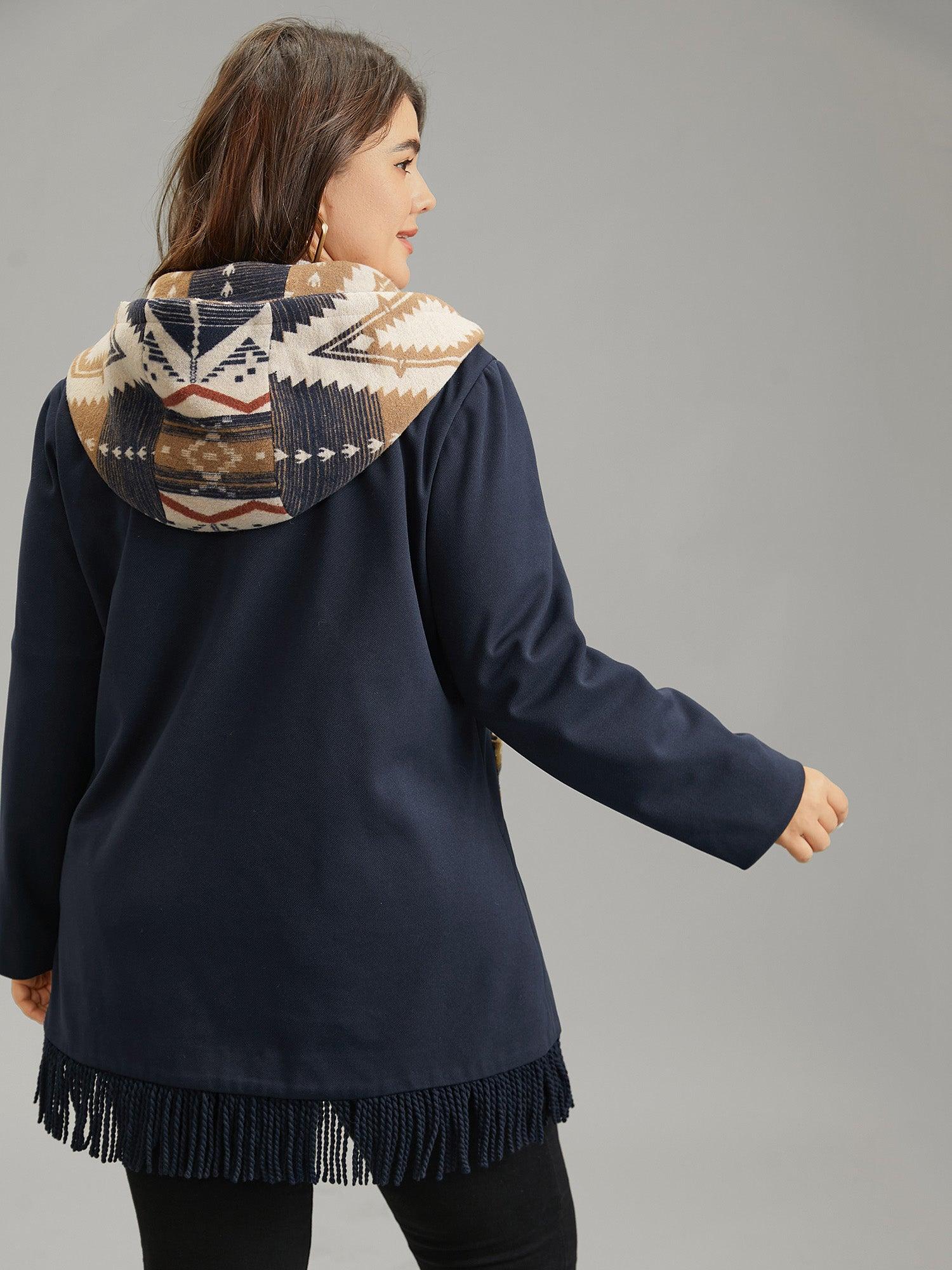 Shop Geometric Contrast Hooded Tassel Trim Coat now and redefine your style with confidence at BloomChic. Tailored for mid and plus-size women. This trendy Outerwear Women, sizes 10-30. Season:Winter;Color:Midnight;Style:Elegant;Pattern Type:Bohemian Print;Details:Pocket, Button, Patchwork, Contrast, Tassels, Lined;Pocket:It is perfectly sized to carry a phone.;Snap Fastener:No-snap fastener;Belt:No-belt;Closure Type:Button