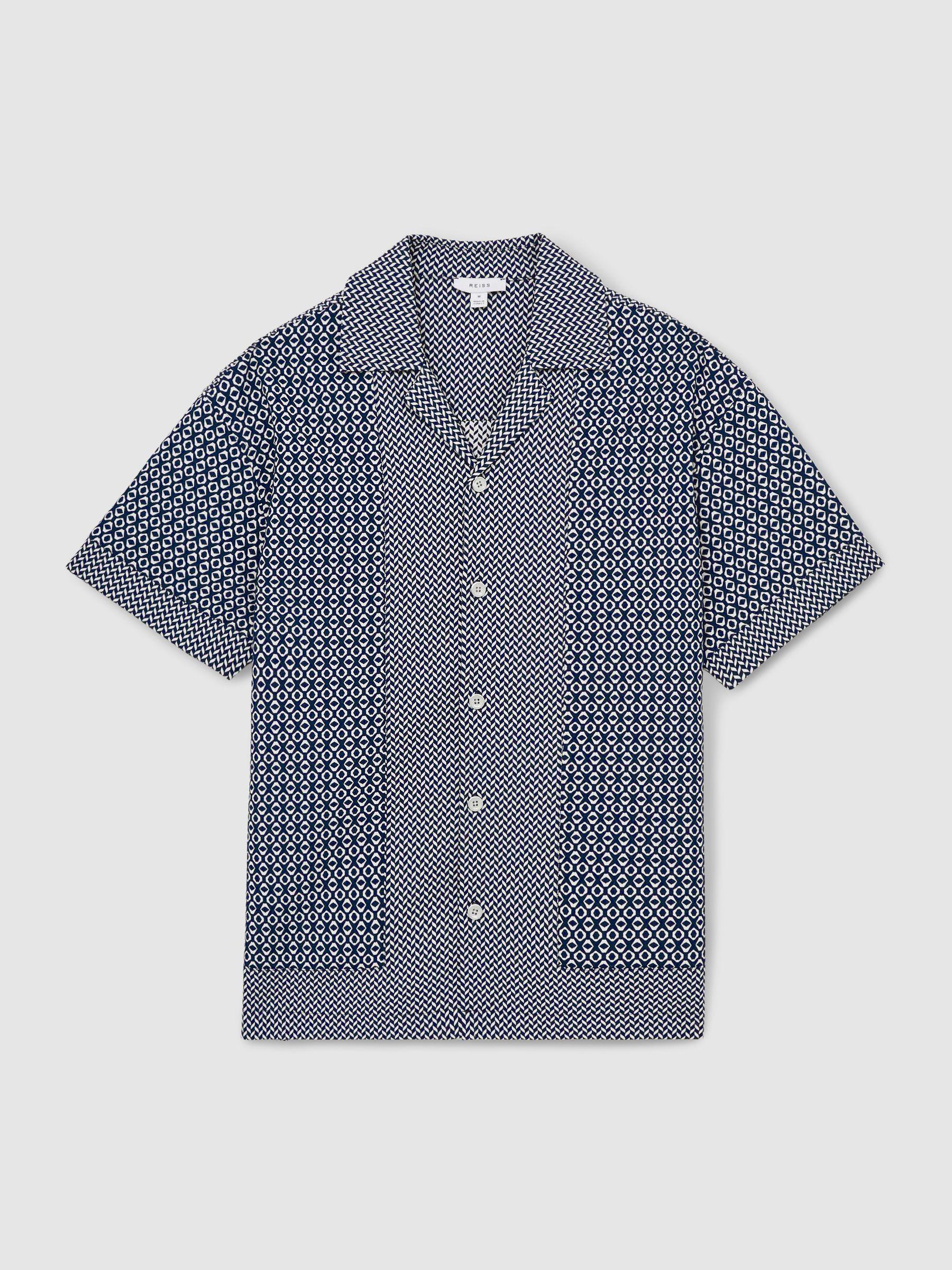 The Matisse shirt is crafted with textured geometric jacquard panels for a bold, artistic look. A Cuban collar maintains a relaxed look, while a French button placket offers a seamless finish. Crafted with cotton. Textured geometric jacquard. Cuban collar. Short sleeves. French button placket.