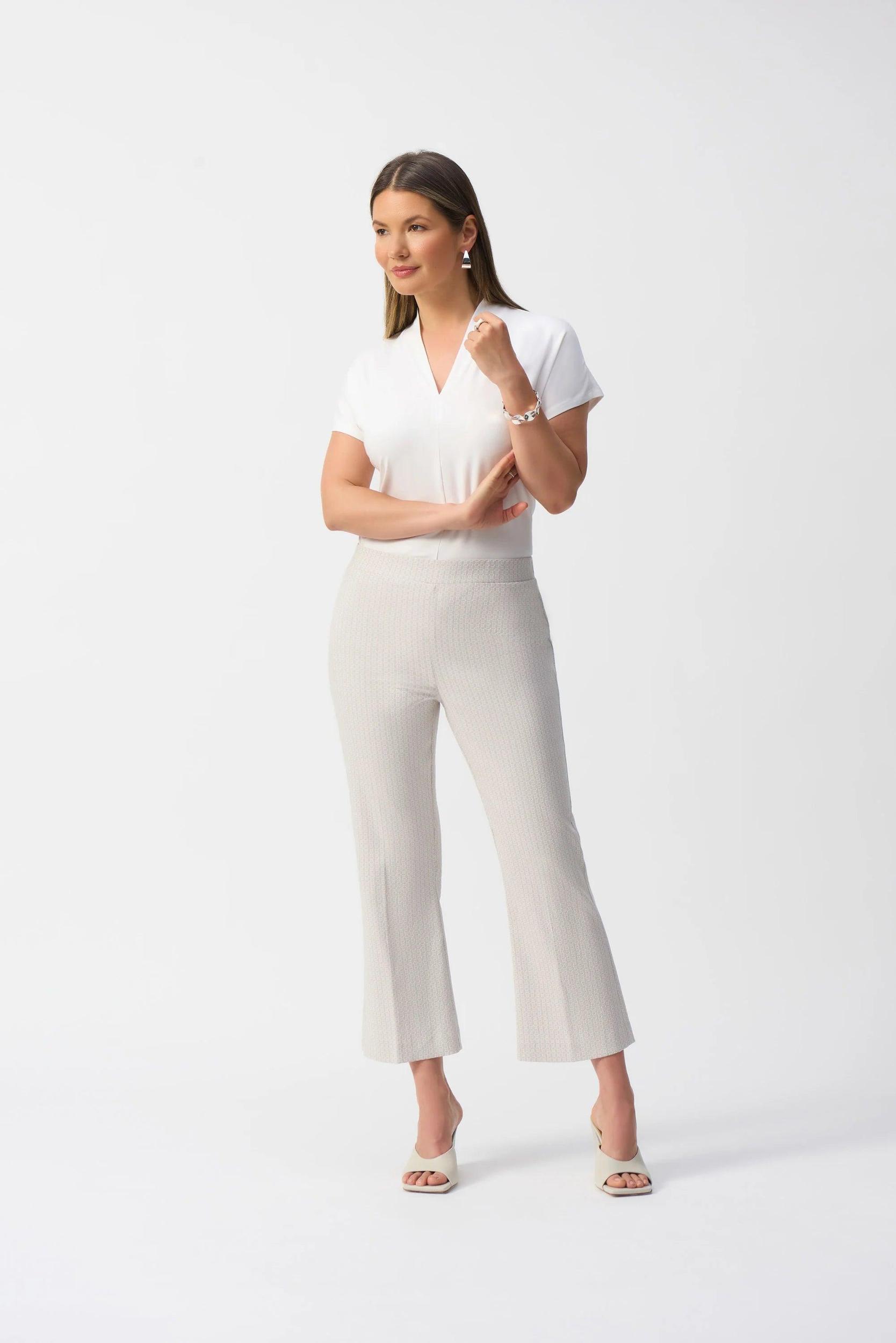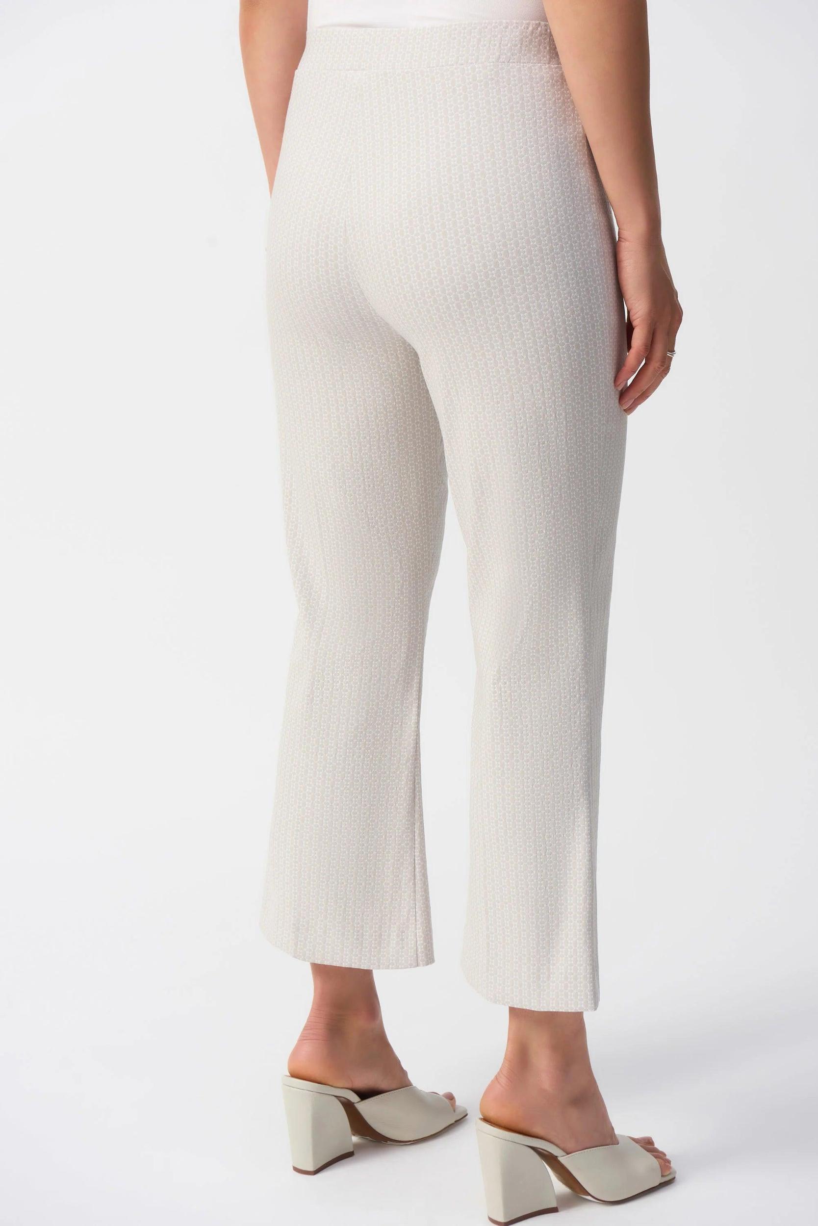 The flared silhouette of these pull-on pants exudes flawless sophistication. The jacquard fabric, adorned with a beautiful geometric print, gives a polished look to this contemporary design. The garment is crafted with a covered elastic waistband with your utmost comfort in mind.